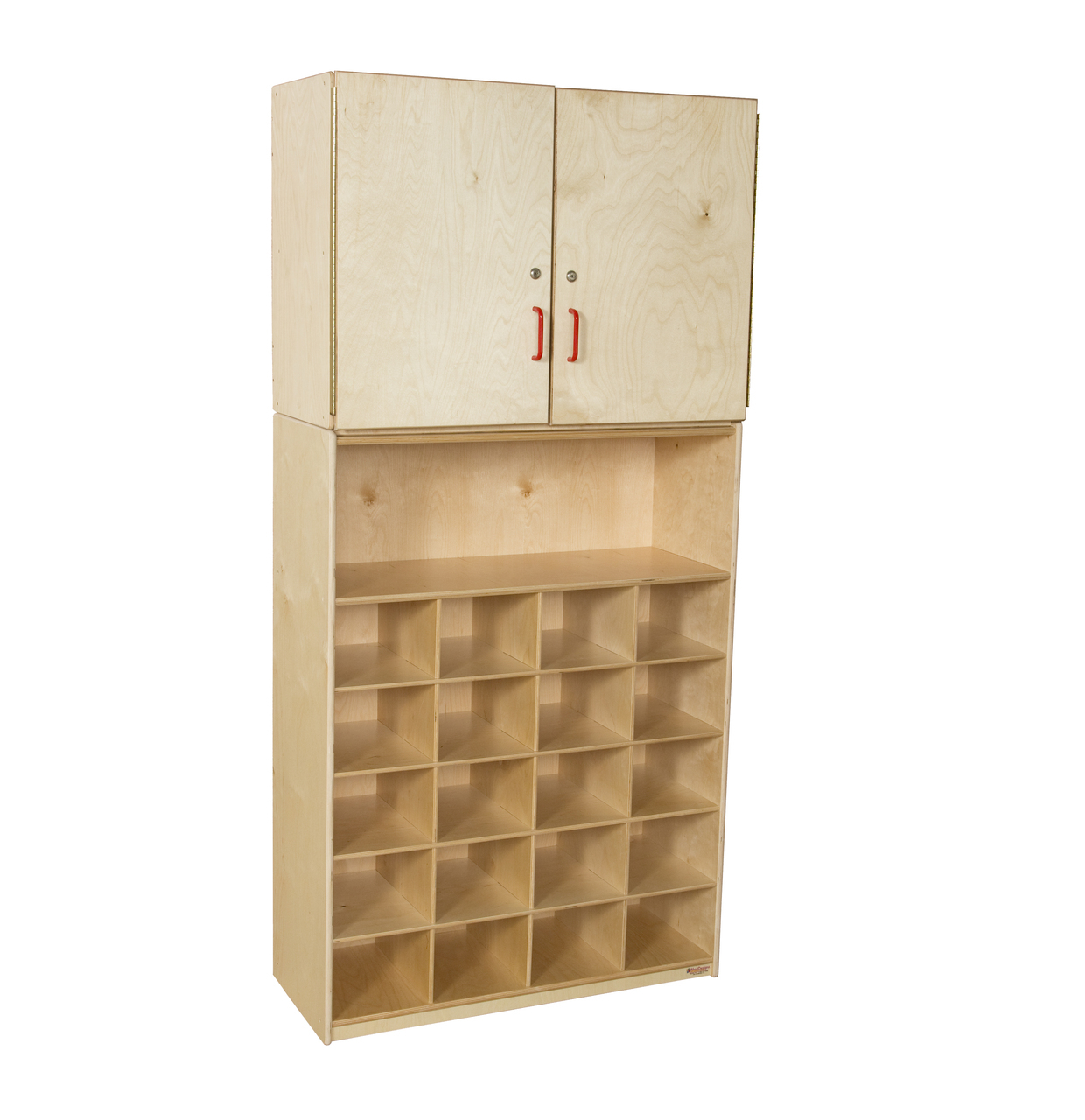 Vertical storage unit with cubby base, fixed shelf center and cabinet top. Room for 20 trays provide storage for small items. The locking top cabinet offers teacher storage to keep items secure. Made with birch wood and finished with an exclusive UV protection finish. Fully rounded edges and corners for additional safety. Recessed back for added stability, strength, and beauty.