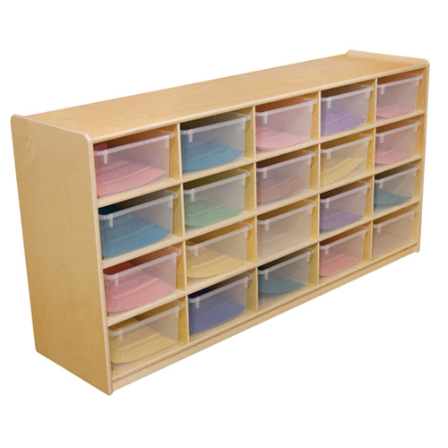 20 translucent letter size trays can easily store all small manipulatives and materials to stay organized and keep them from getting misplaced. All wooden surfaces are birch plywood with an exclusive Tuff-Gloss UV finishing. Recessed back adds stability, security, and beauty. Fully rounded corners and edges for safety. Casters add additional mobility options.