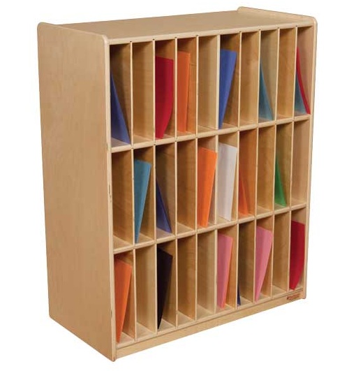 30 vertical slots for storage of portfolios, books, puzzles, and other slim belongings. Removable dividers add flexibility. Made with birch wood and finished with UV protection. A recessed back adds stability, strength and beauty. Fully rounded corners and edges for additional safety.