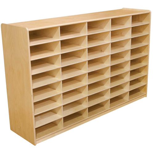 Room for 40 letter trays that can store all small manipulatives to keep them from getting misplaced. All wooden surfaces are birch plywood with an exclusive Tuff-Gloss UV finishing. Recessed back adds stability, security, and beauty. Fully rounded edges and corners for safety. Casters add additional mobility options. Trays Not Included