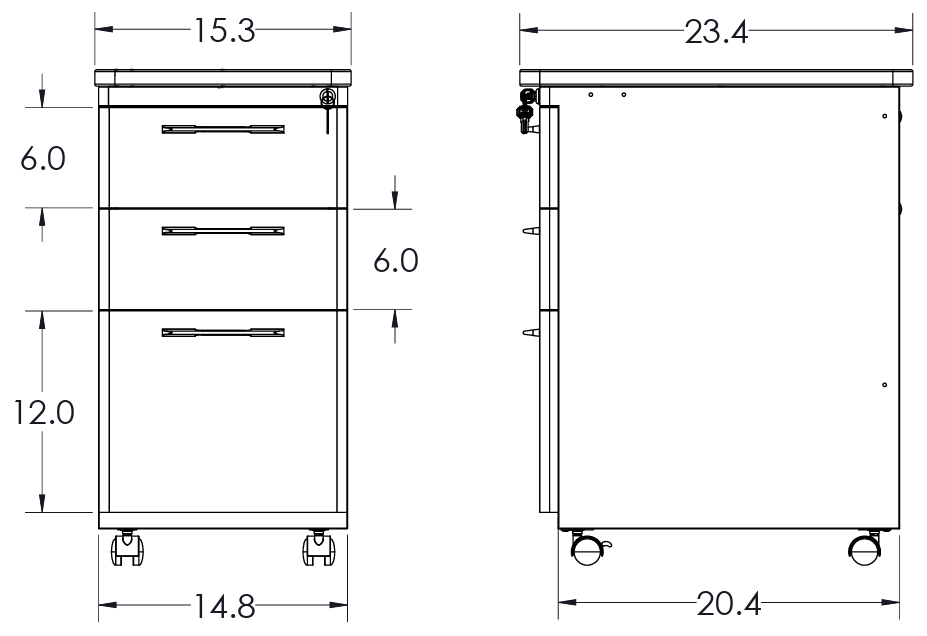 Add secure mobile storage to your desk setup with this pedestal cabinet! Featuring three locking full extension drawers; the smaller drawers include dividers while the large drawer accepts hanging files. The top surface is durable high pressure laminate and features T-mold edge banding. Mounted on casters for easy mobility. Pair with other Avid products to create a cohesive space! Optional glides include spacers to match height of casters.