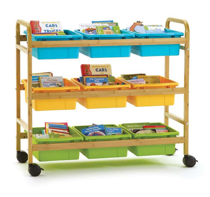 This mobile book browser offers a more sustainable option for classroom organization. Eco-friendly bamboo construction offers long-lasting durability in early childcare environments. Featuring nine Large Open Tubs for storing various sized books, toys, supplies and more! Mounted on four locking casters for easy mobility. The optional pegboard allows for additional storage along the sides of the unit (hooks included with pegboard). Pegboard Kit sold separately.