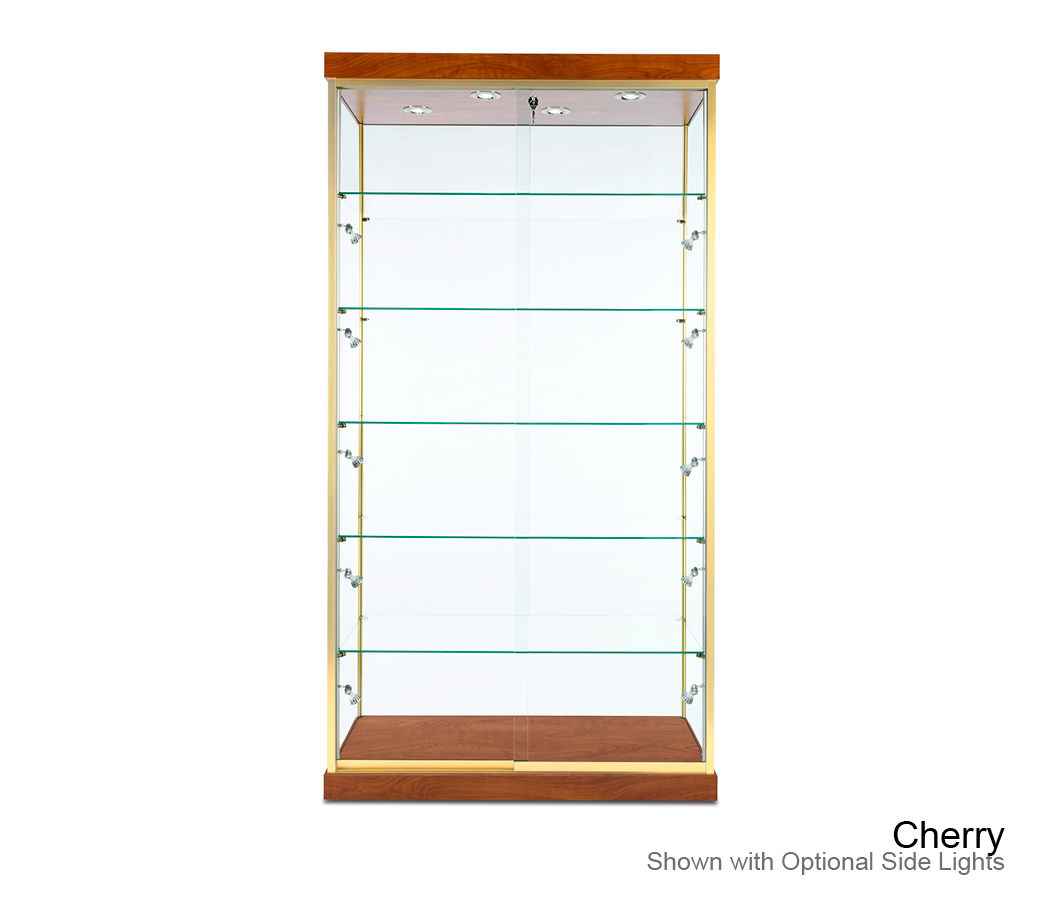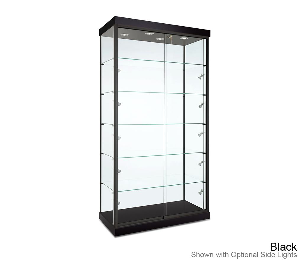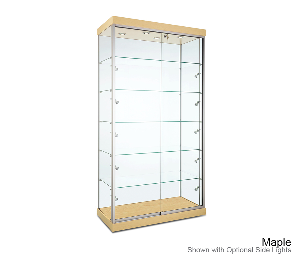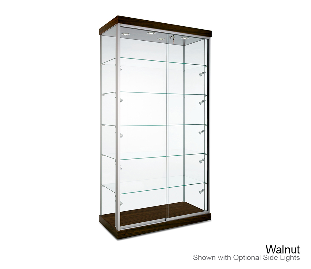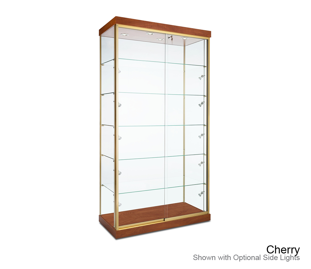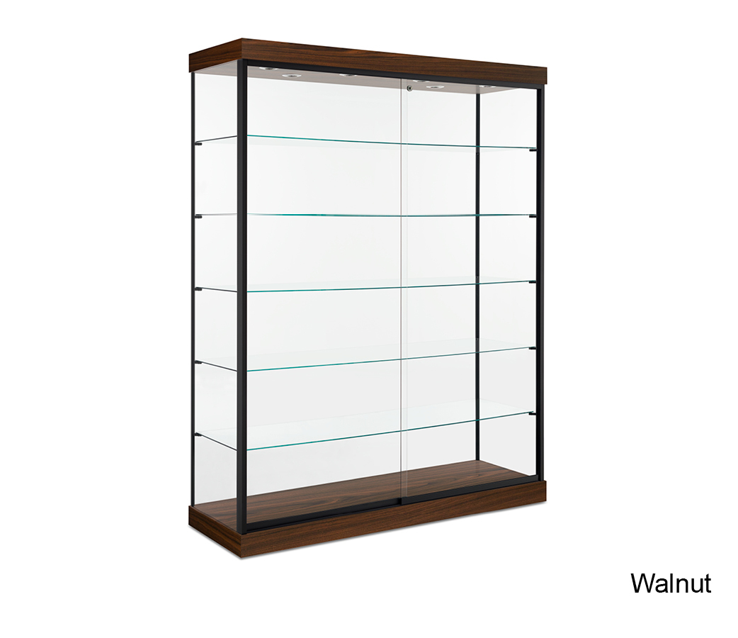 A truly magnificent showcase designed to create the illusion of a more expansive display area! All four sides are glass, making your space feel larger while offering an unobstructed view of your trophies, awards, art, and more! Each glass shelf is fully adjustable to create a large enough display space for any objects. The use of tempered glass adds an additional level of durability and security. LEDs in the top of the case provide accent lighting. The large sliding glass doors include a lock for security.