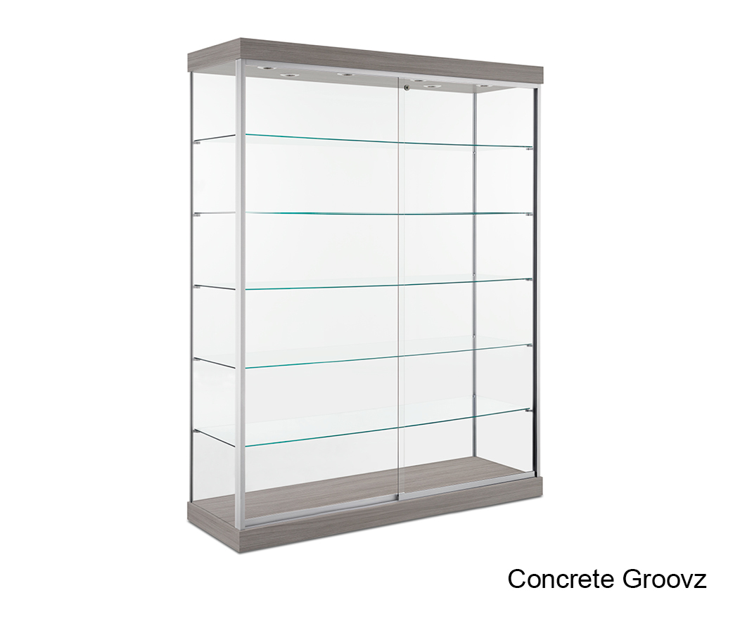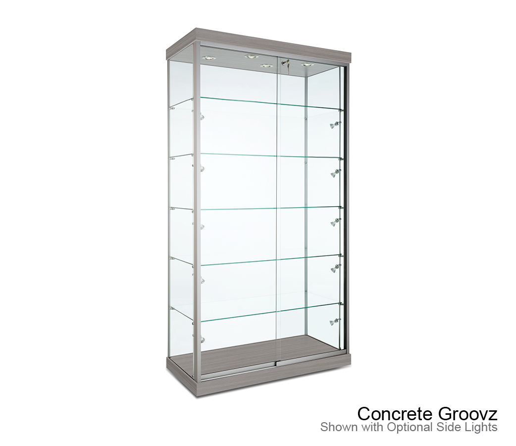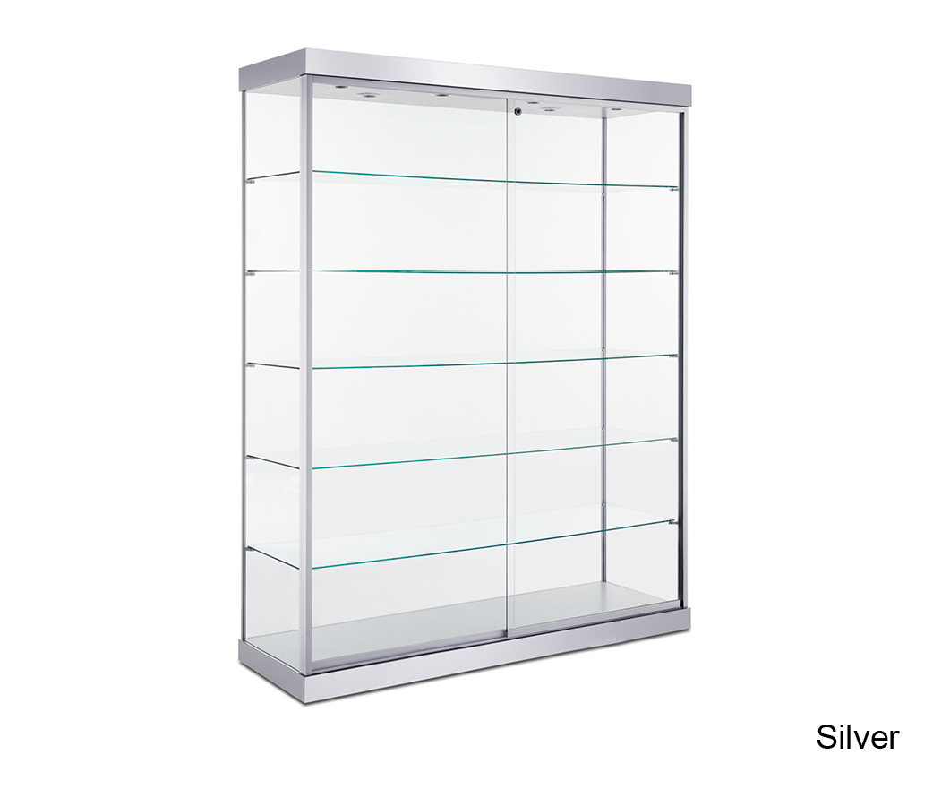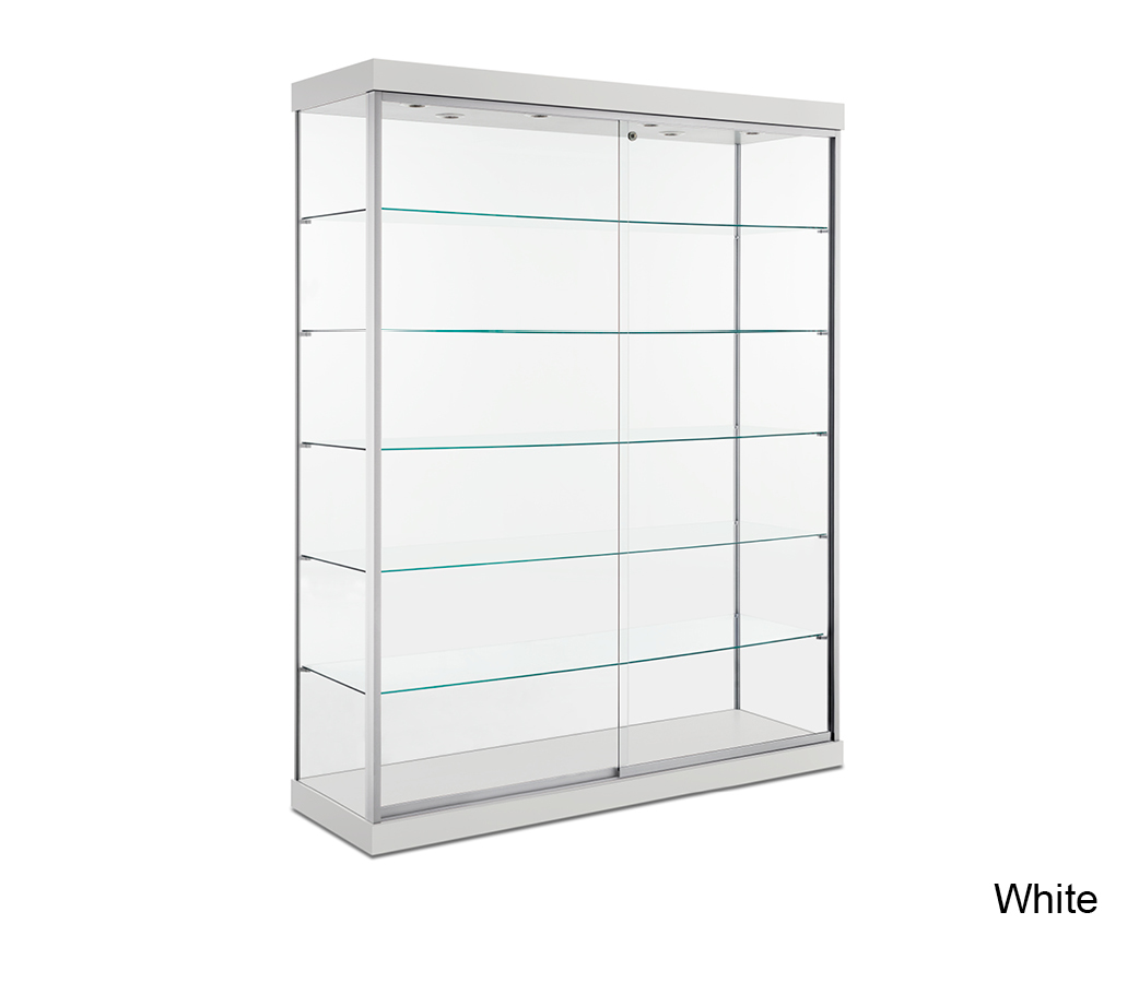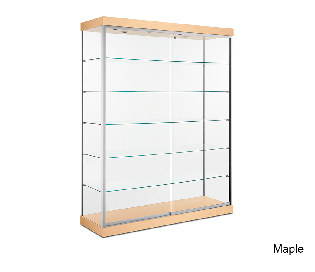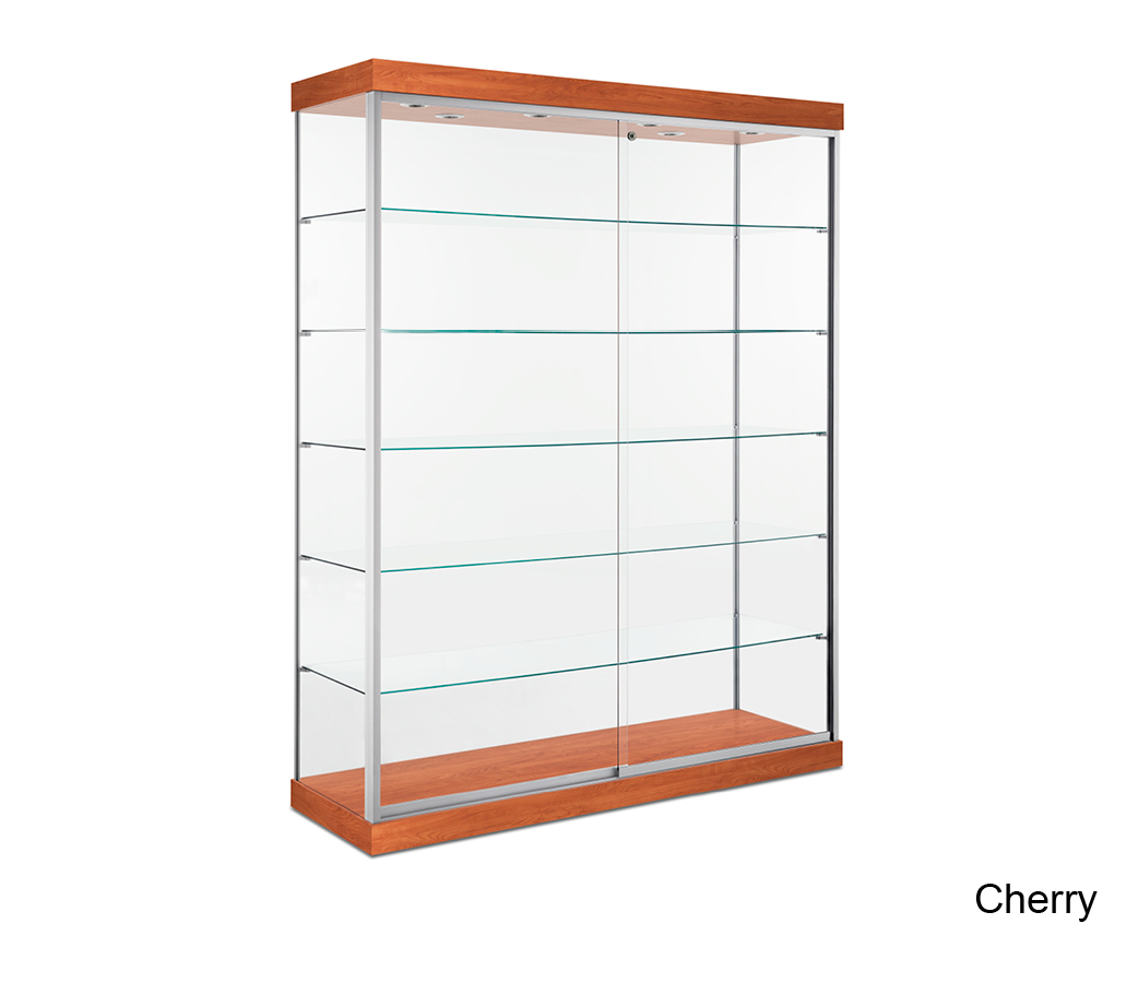 A truly magnificent showcase designed to create the illusion of a more expansive display area! All four sides are glass, making your space feel larger while offering an unobstructed view of your trophies, awards, art, and more! Each glass shelf is fully adjustable to create a large enough display space for any objects. The use of tempered glass adds an additional level of durability and security. LEDs in the top of the case provide accent lighting. The large sliding glass doors include a lock for security.