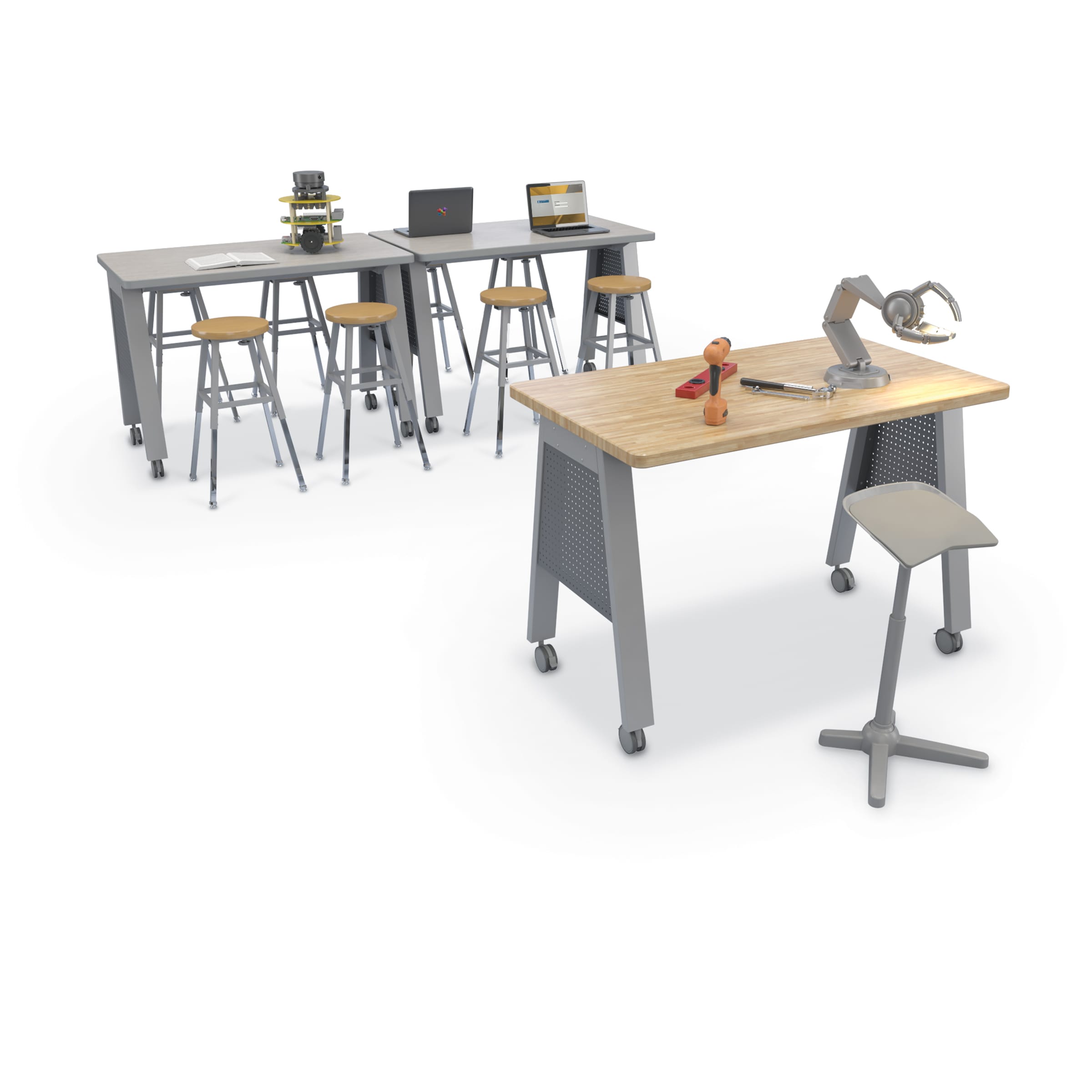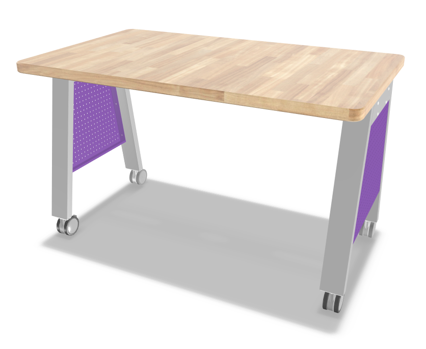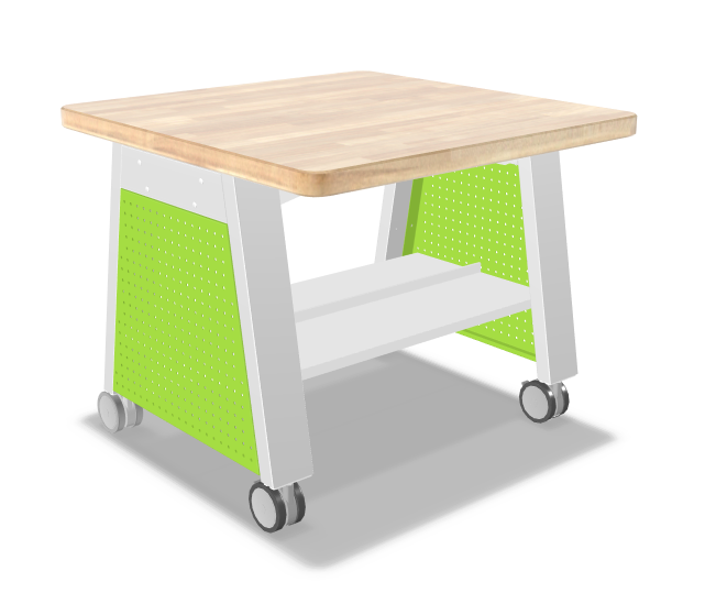 Empower your students to think, create, and do with this essential makerspace table! Designed to accommodate writing, drawing, experimenting and more, this table makes it easy to create a hands-on learning atmosphere. Featuring a spacious solid wood butcher block top for a beautiful, quiet, and more forgiving workspace. Suitable for students of all ages with rounded work top edges for a safe learning environment. Mounted on a platinum powder-coated steel frame with dual-wheel casters. Side panels and shelves sold separately.
