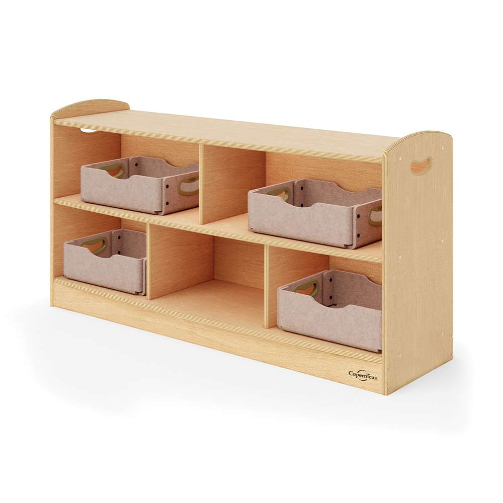 No early learning space is complete without shelving! This dual level shelf is designed for versatility and stability in classroom environments and works well as a stand-alone unit or combined with other Copernicus Seoras Shelving to create an almost limitless number of classroom configurations! The smile-shaped handles offer an easier, more ergonomic way to move the shelf when needed. The shelf can be used to build room dividers, reading corners, or simply placed against a wall.