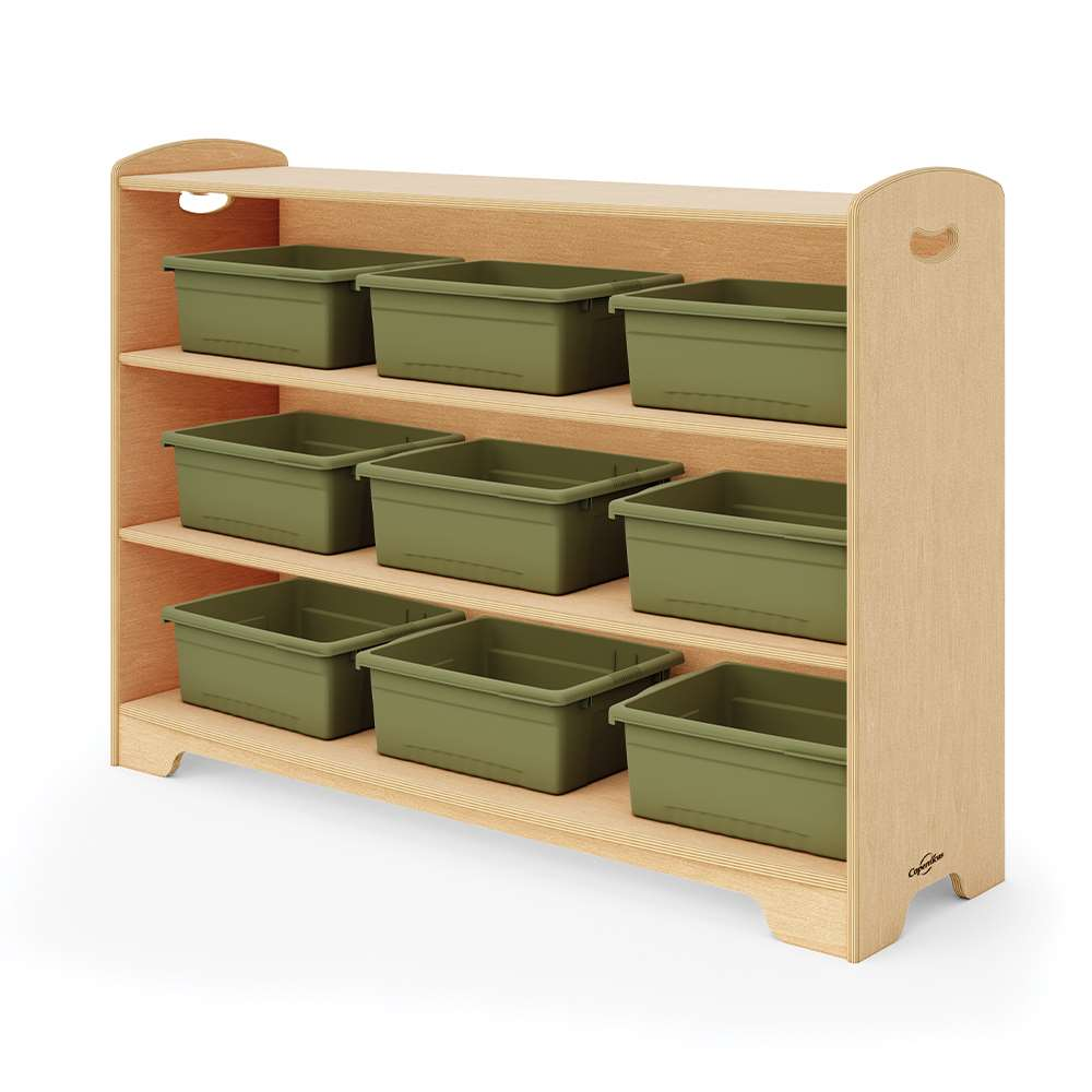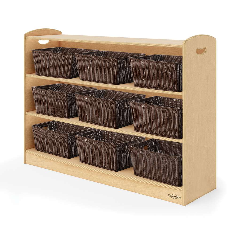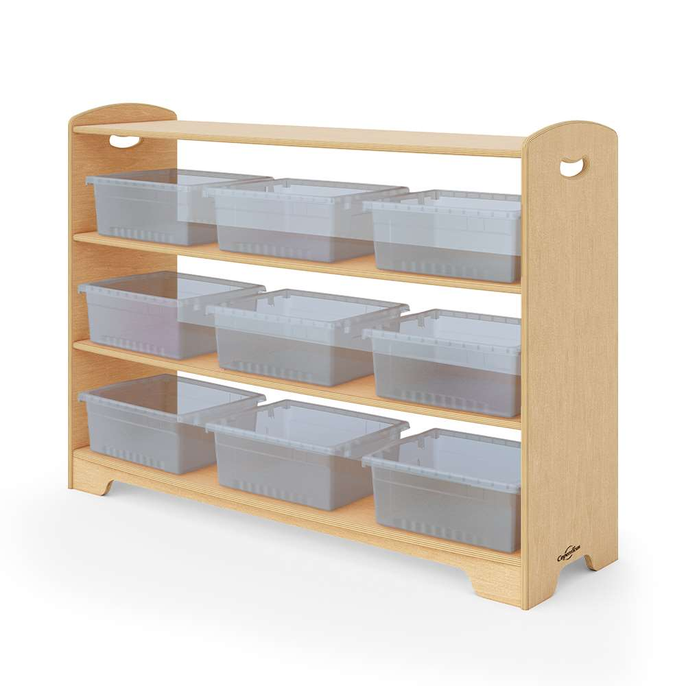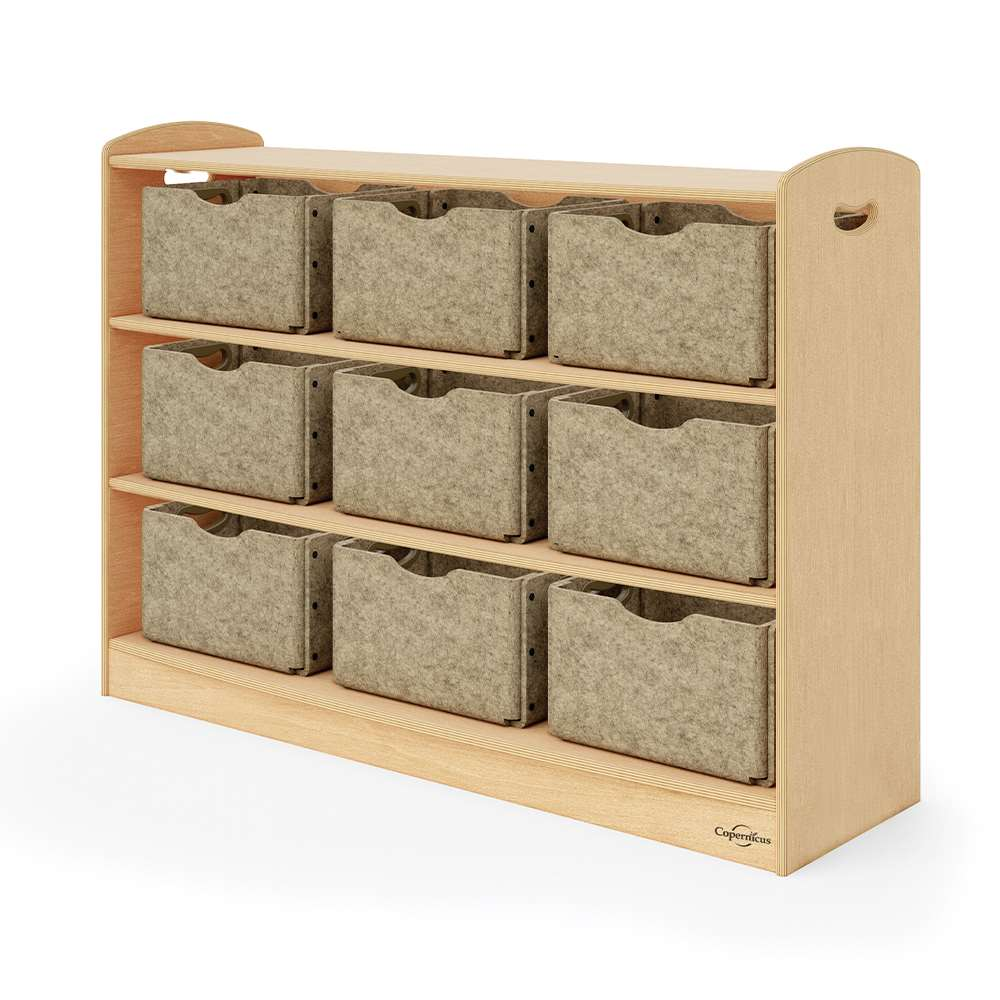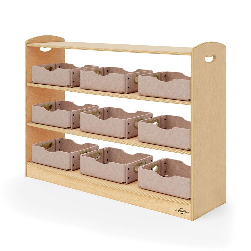 No early learning space is complete without shelving! This three level shelf is designed for versatility and stability in classroom environments and works well as a stand-alone unit or combined with other Copernicus Seoras Shelving to create an almost limitless number of classroom configurations! The smile-shaped handles offer an easier, more ergonomic way to move the shelf when needed. The shelf can be used to build room dividers, reading corners, or simply placed against a wall.