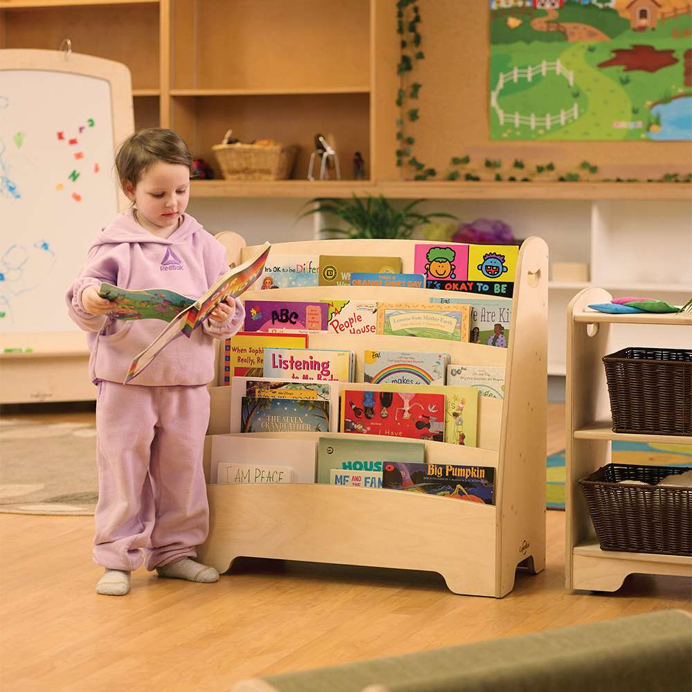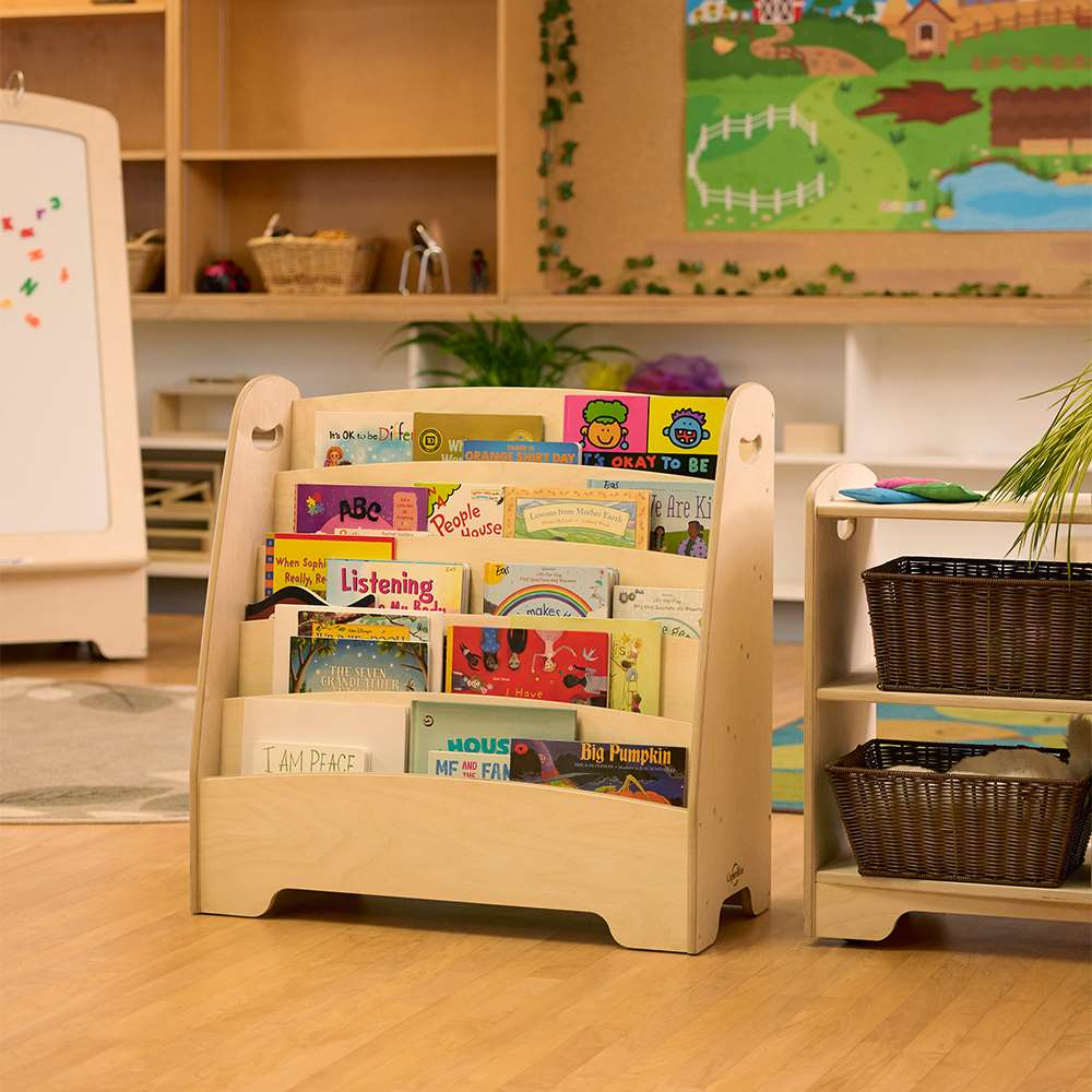 This birch book display helps to create an inviting space where young learners can help themselves to one of their favorite books. Depending on how the space is arranged, this single-sided display can be used against a wall or act as a classroom divider!