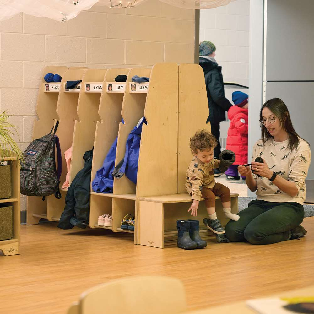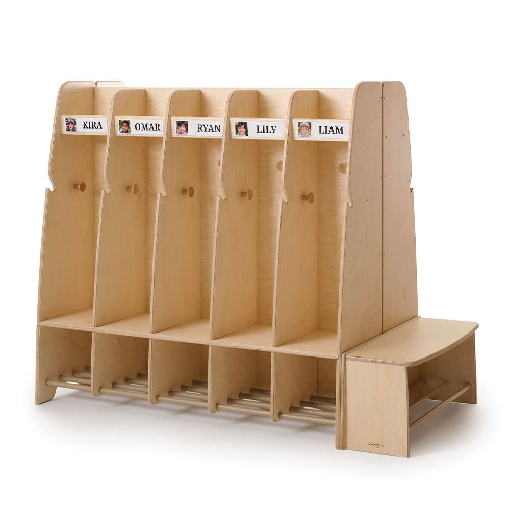 This little cubby is designed to fit perfectly at the end of a cubby island made up of multiple Copernicus cubby units. It acts as a handy spot for young learners to sit and put on their shoes and features hooks that allow children to hang their belongings. Must be fastened to a cubby island.