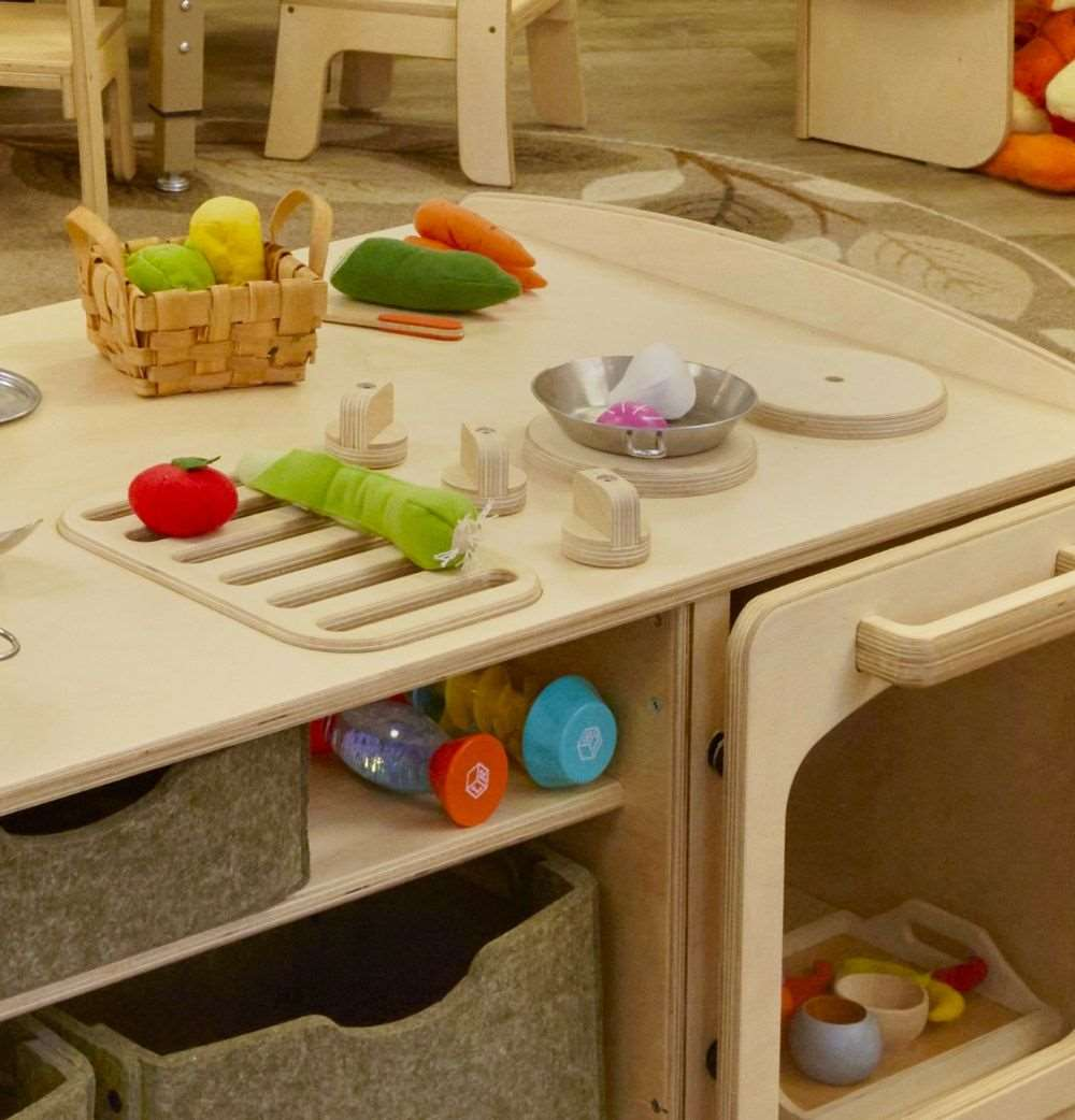 Spark collaborative and imaginative play with this fully equipped kitchen island! It is designed for all round access for young learners to make believe and role play. This island features a sink, burners, grill, washer, dryer, stove, storage cubbies, and a spot to hang a towel. All of the knobs even turn for added realism! The open counter space offers ample room for food prep and collaboration. There are no pinch points due to the unique hinge design. The grill and sink can be fastened in place if desired.