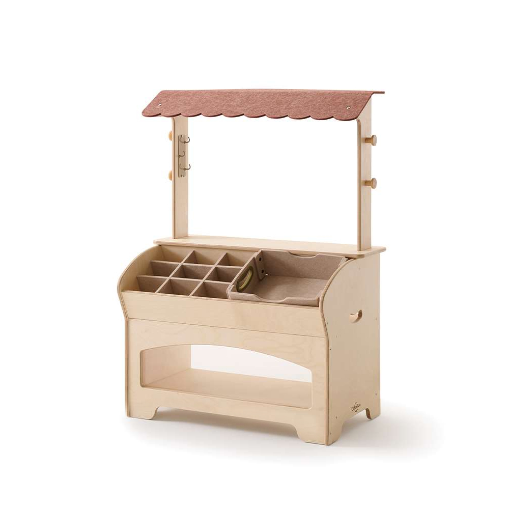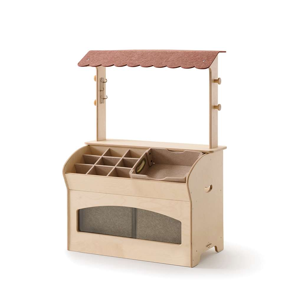 From children's theater performances to after lunch checkout counter, this market stand is a dynamic piece of dramatic play furniture. The stand features a pass-through window and counter and shelving to maintain organization. Under the awning there is a rod to add curtains (not included) to turn this into a puppet theater!