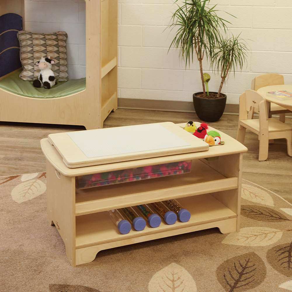 Sensory play helps to develop fine motor skills, cognitive growth, and self-regulation skills in a fun and engaging way. Young learners tend to learn best through hands-on, sensory-focused experiences; making this sensory table a must-have for any PreK classroom, kindergarten, and daycare! The table includes a large clear tub that can hold toys, sand, water, or other materials. It's easily emptied by lifting the tub and dumping - no drain plugs to fail! Included is a construction brick tabletop which acts as a removable lid, providing the freedom to build on the floor or another table while the Sensory Table is in use. The opposite side of the lid is mirrored for additional sensory experiences. When not needed, the lid can be slid neatly in to the built-in storage shelf.