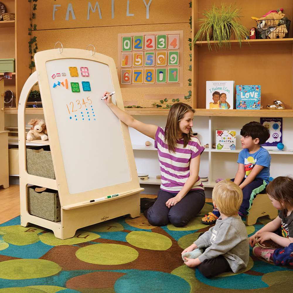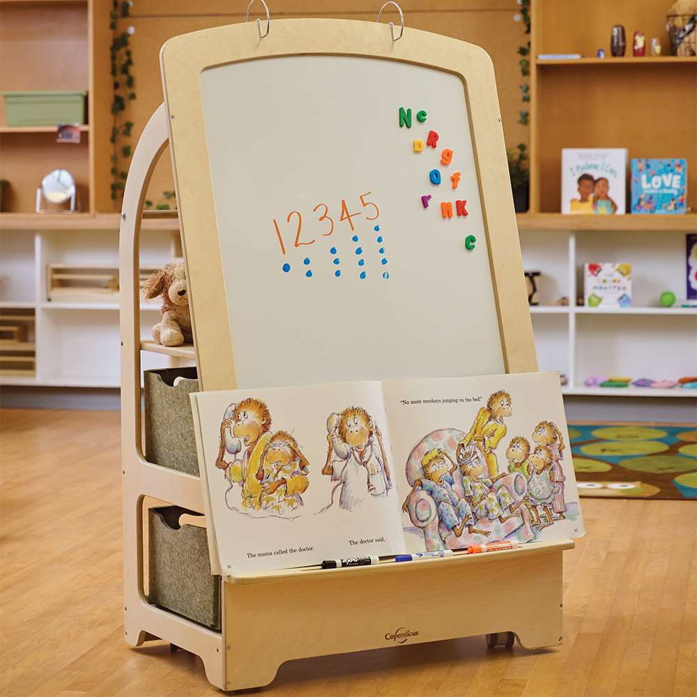 This wooden easel is designed specifically for early childhood environments and kindergarten classrooms, acting as the perfect tool for children to gather around for a lesson. Young learners can develop their communication skills and confidence as they share ideas and participate in group whiteboard activities. The front whiteboard is mounted while the back whiteboard can be removed, both are magnetic. To maintain organization there are multiple storage shelves. With its durable casters, instructors can easily move this easel anywhere in the classroom as configurations change.
