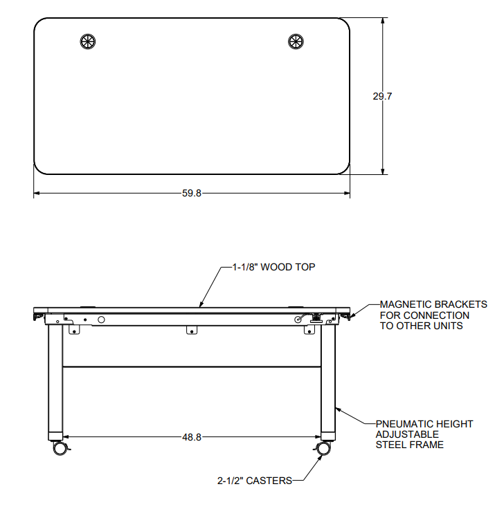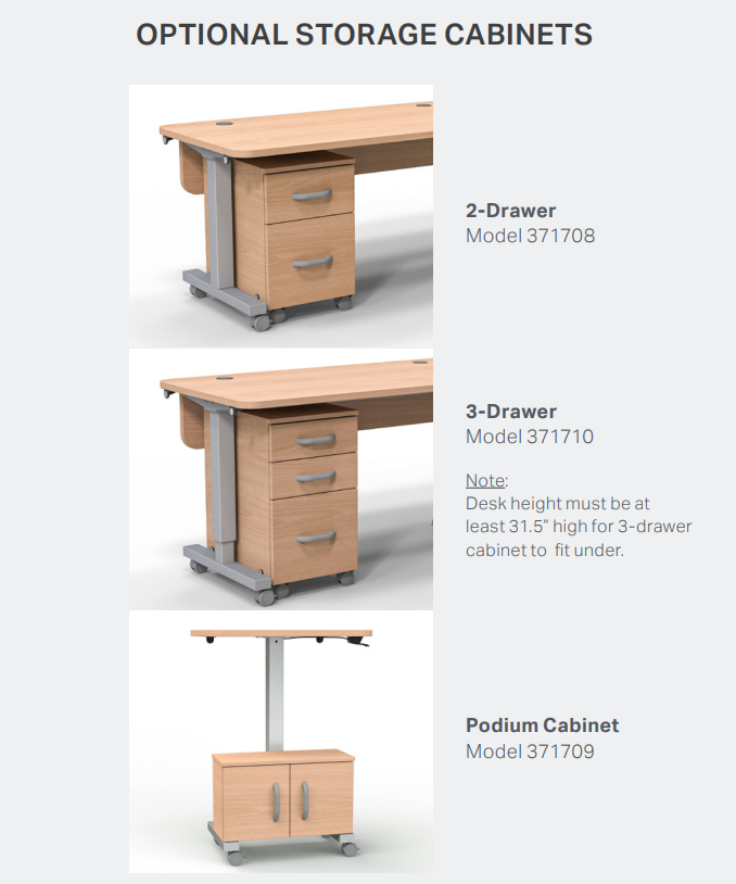 Teach with presence. Move with purpose. The way instructors move throughout the room can grab attention, promote a positive energy, and help create meaningful connections with students. This next gen pneumatic desk and podium is easy-to-use, handle-operated pneumatic height adjustability paired with integrated casters which allows instructors to control how and where they teach their class. Integrated magnets in the sides allow the two units to effortlessly connect together. The desk features integrated wiring grommets for organization and a modesty panel for added privacy. 2-Drawer and 3-Drawer Cabinets are mounted on casters and include a lock for secure storage. The Podium 2-Door Cabinet is designed to mount to the bottom of the Pneumatic Podium, no lock is included. All cabinets are constructed of light duty melamine. Designed for modular classrooms, this pneumatic teaching set helps keeps instructors and their students stay on cue.