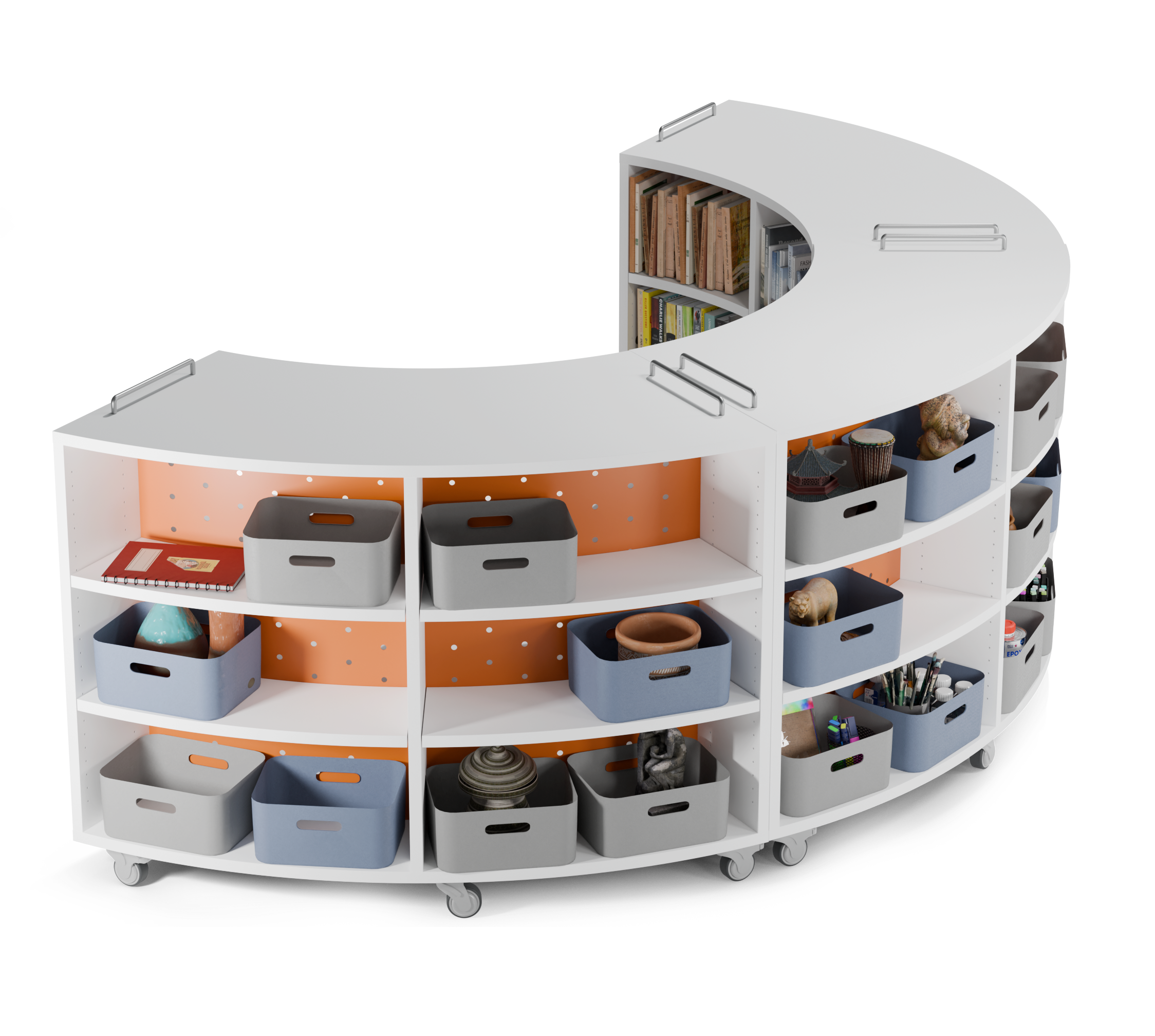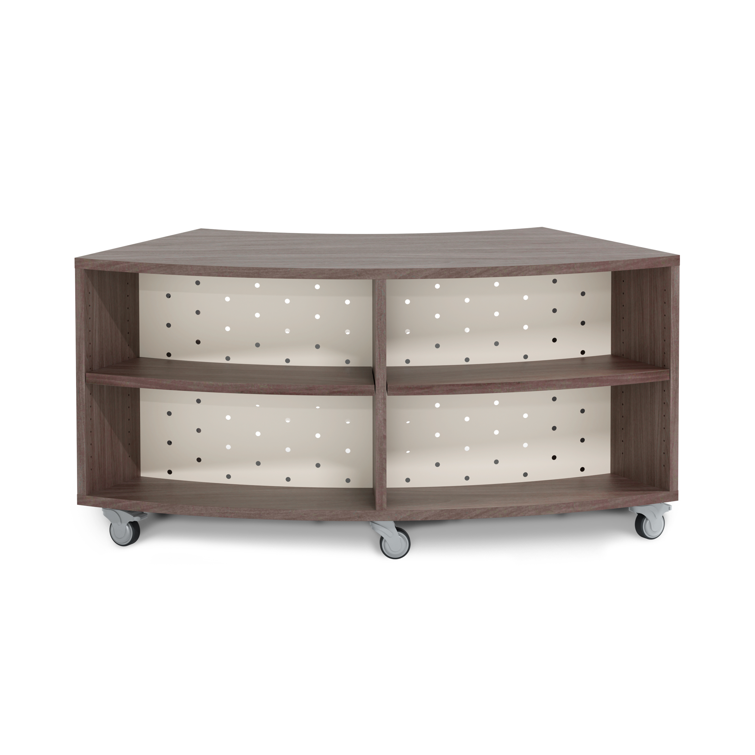 A key addition to your classroom or library! This double sided curved bookcase offers a stylish laminate cabinet with a perforated metal back panel. Mounted on smooth rolling casters for easy mobility. Use this unit as a stand-alone model or combine multiple to create fun shapes and unique classroom layouts!