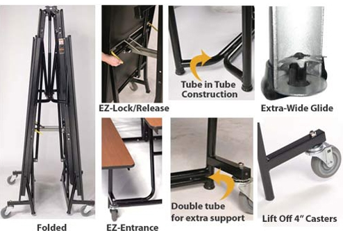 Used every day throughout the world in multi-purpose environments, this cafeteria table folds in the middle for easy movement and compact storage. Integrated benches provide group seating with easy set-up. Engineered with safety, durability, ease of operation, and long-term value in mind. AmTab cafe tables are 100% Made in the USA, LEED 2009 certified, ANSI/BIFMA x7.1 certified, and MAS Green certified.