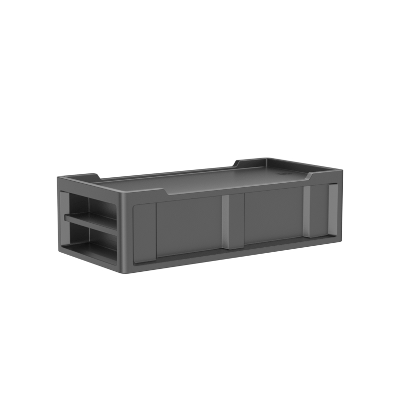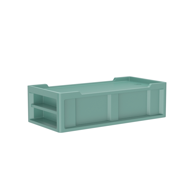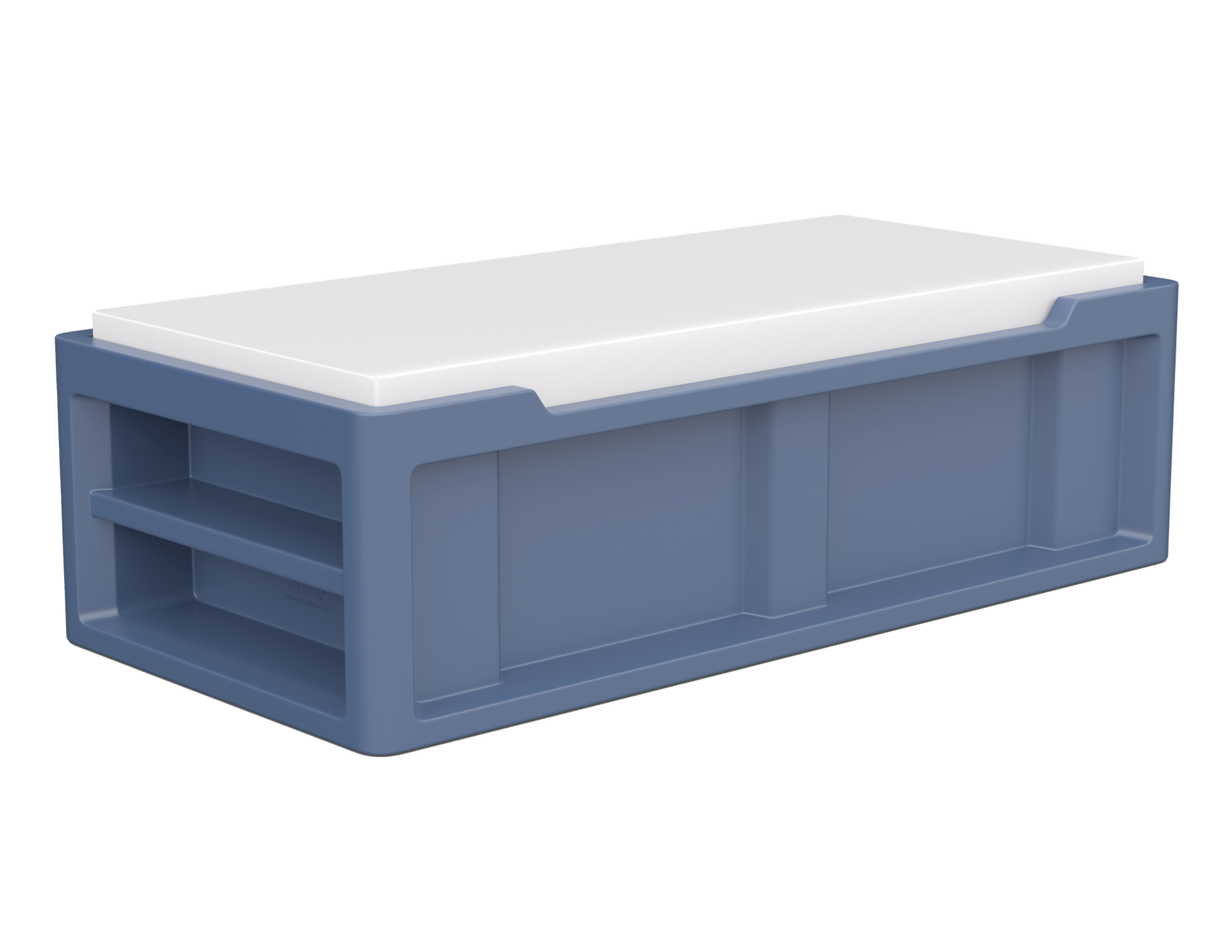 A rotationally molded, one-piece bed frame with a space saving design that is engineered to withstand continuous use in rigorous environments. This model features molded-in storage shelves at the foot of the bed for personal storage. Mattress sold separately.