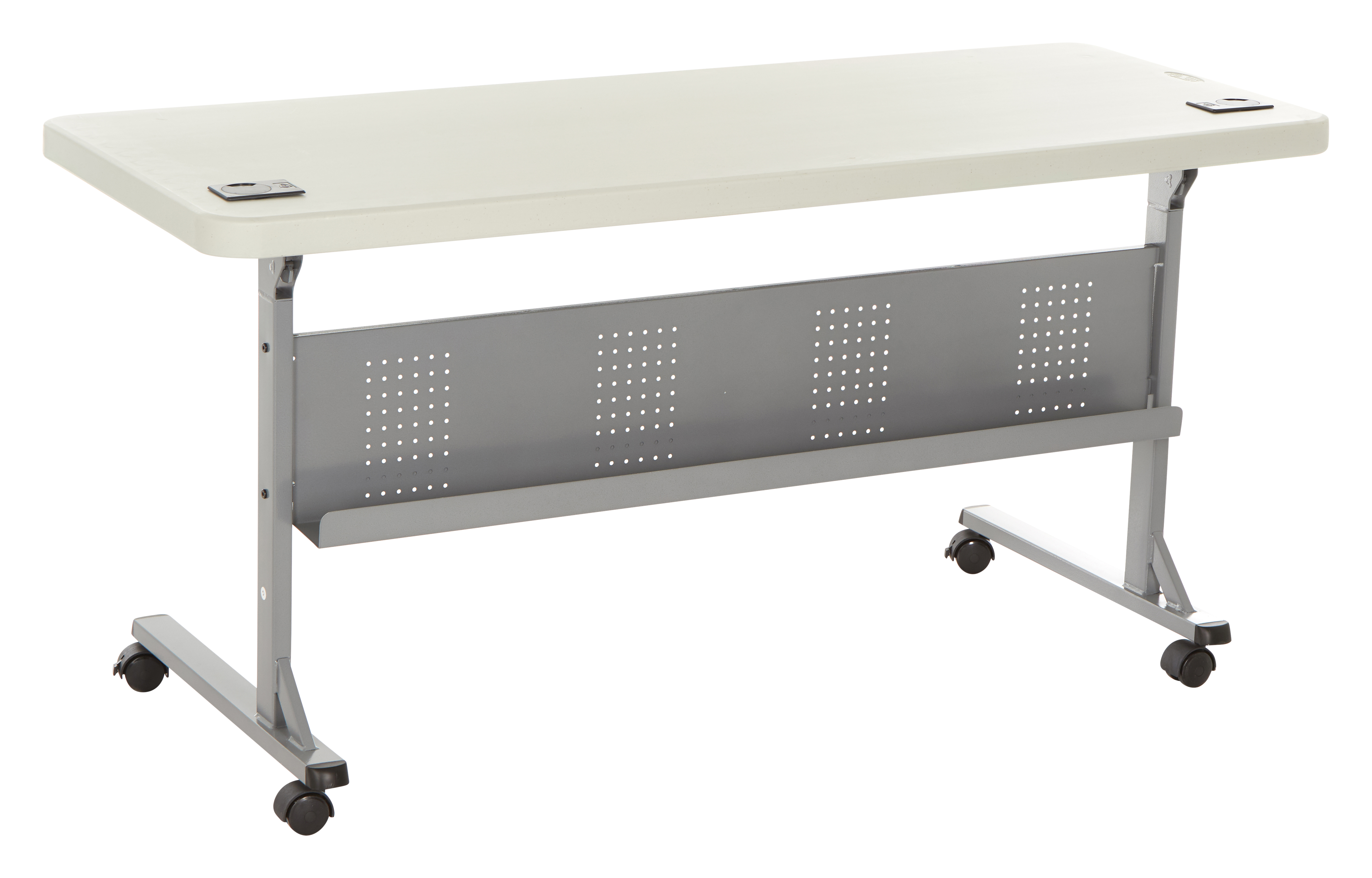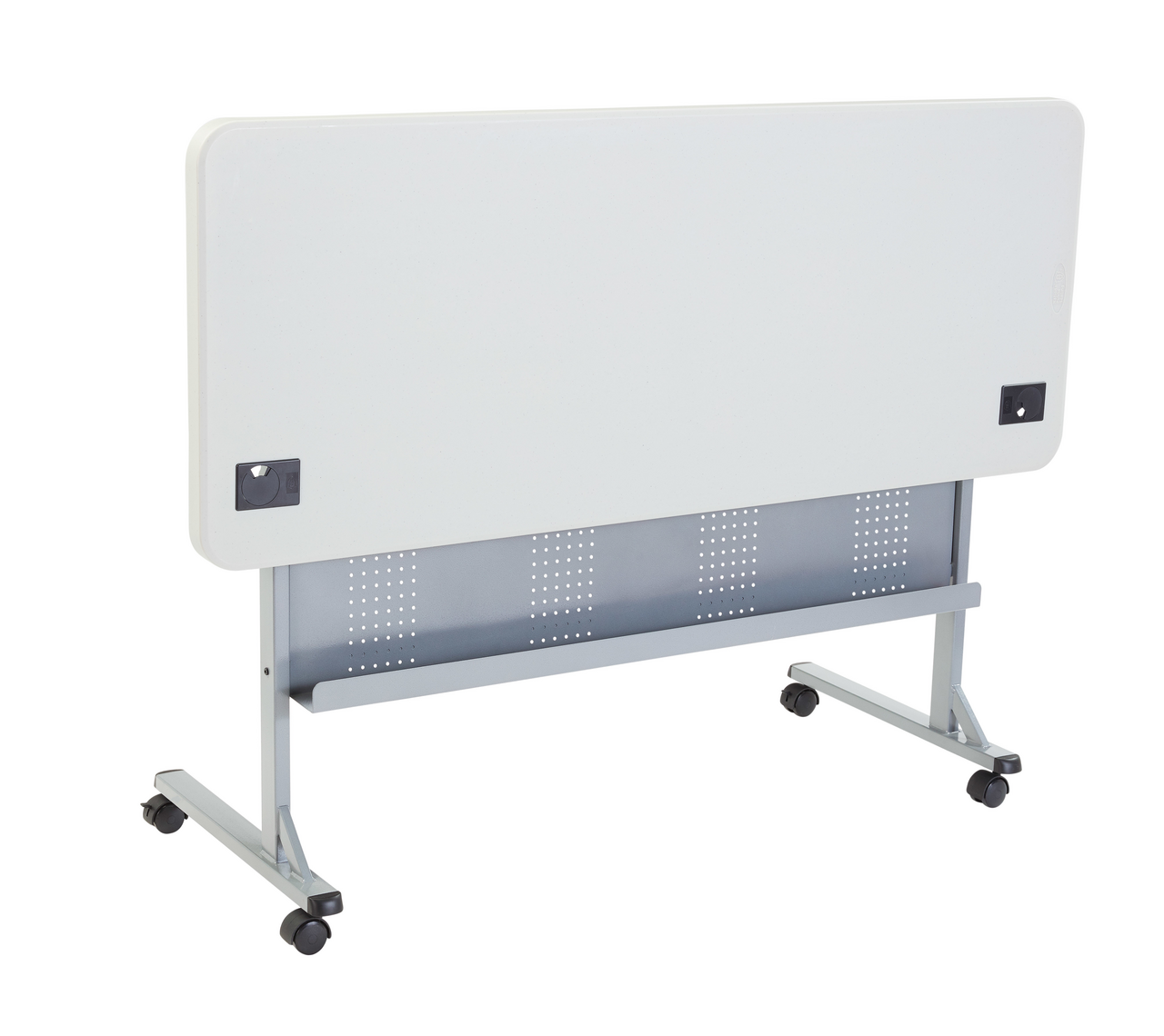 The National Public Seating Flip and Store Table is perfect for any training room, conference room, or seminar set up. Easy to move and store, as this is a lightweight table made of blow molded plastic and mounted on four casters, two of which lock. Accessories featured are two grommet holes for wire management, dual levers for easy folding, and a modesty panel with a built-in cable channel. The sturdy powder-coated steel frame and legs offer a hefty weight capacity. A feature-packed and attractive addition to your training room!