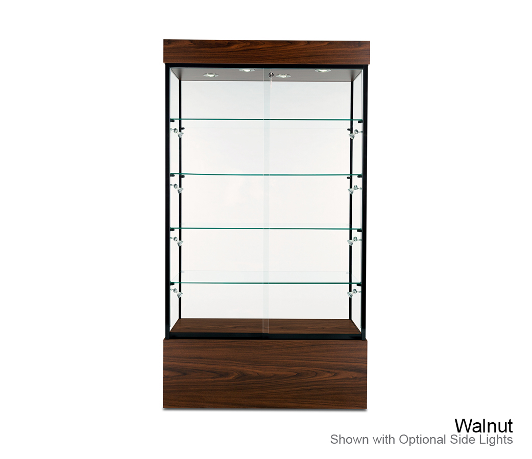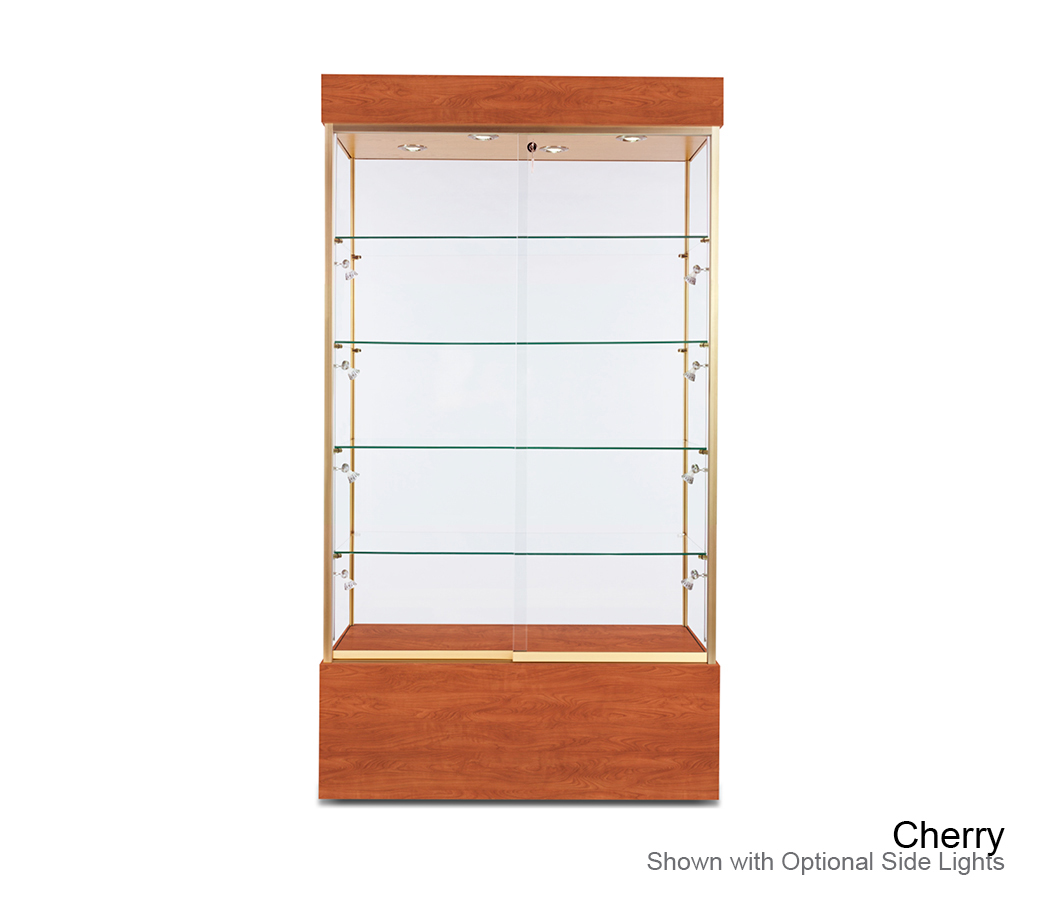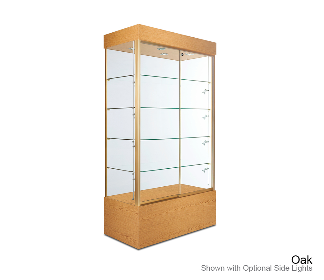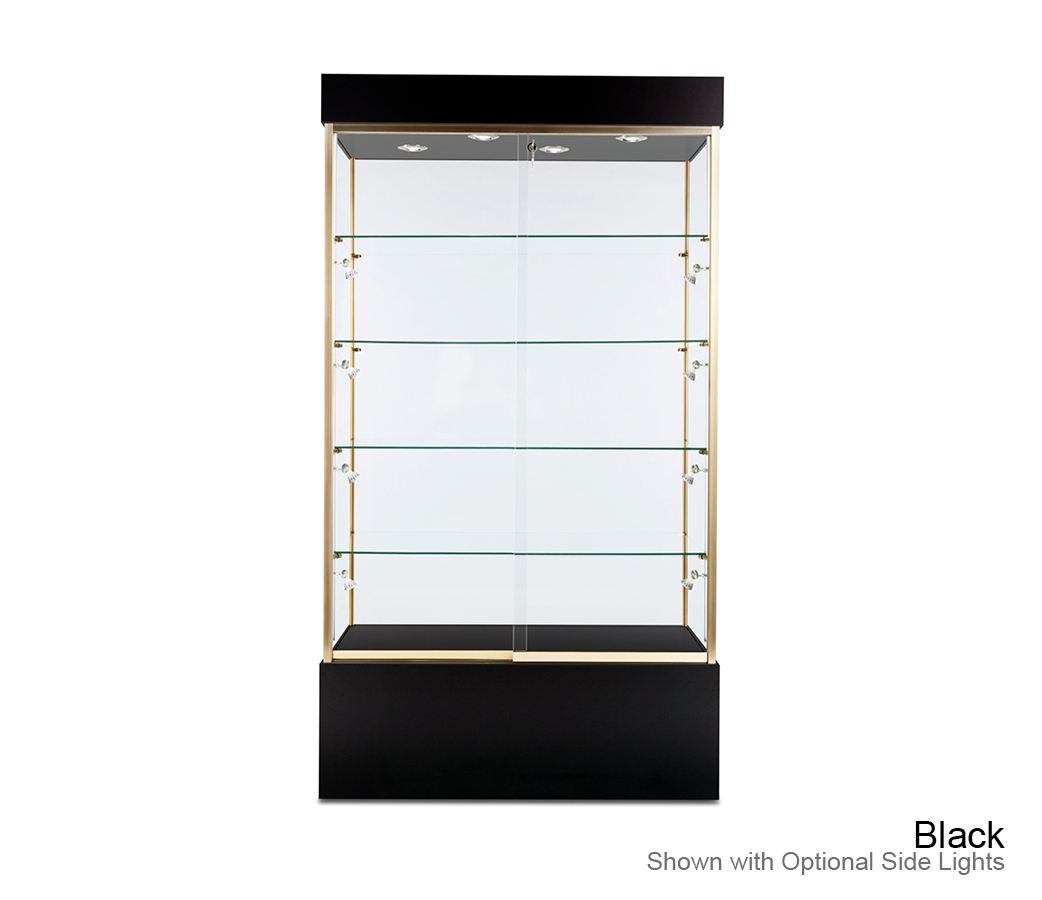 A classic floor display that adds an interesting look to your space while it highlights your awards, trophies, or products! All four sides are tempered glass, making your space feel larger while offering an unobstructed view of what's on display. Each glass shelf is fully adjustable to create a large enough space for any objects. LEDs in the top of the case provide accent lighting. The sliding glass doors include a lock for security.