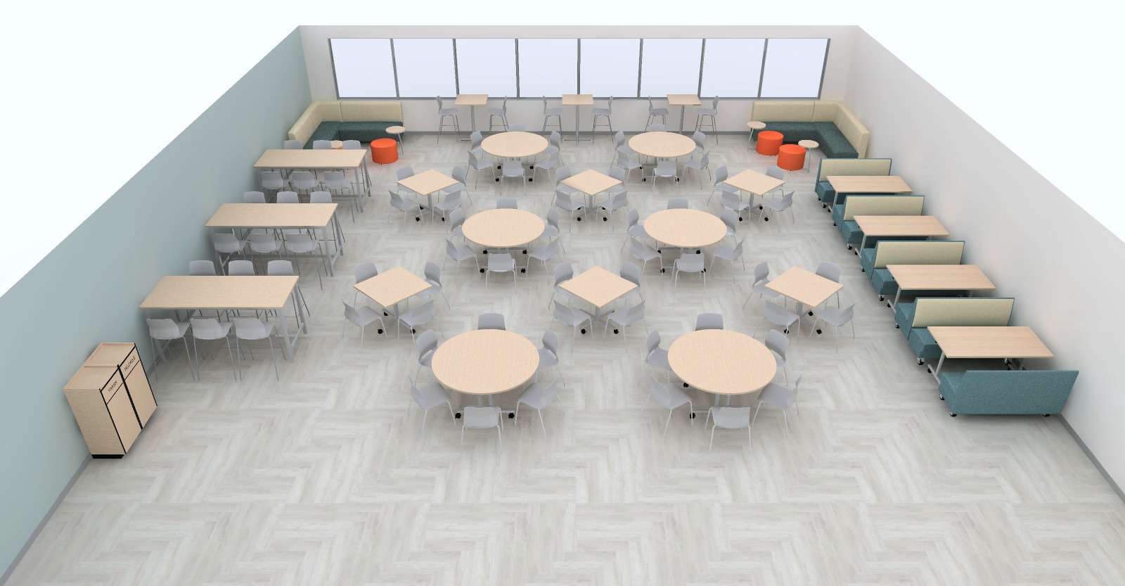 CLASSROOM PACKAGE INCLUDES: (2) Bedford Trash Receptacles, (4) Constellation Rectangle Booths, (2) Constellation Square Inside Corner Booths, (3) Mercury Mobile Double Booths, (2) Mercury Mobile Single Booths, (4) Orbi Round Ottomans, (60) Ander Armless Chairs, (24) Ander Armless Stools, (3) RightEdge Square Tables - 30", (4) RightEdge FlipTop Mobile Rectangle Tables - 60"L, (6) RightEdge Mobile Square Tables - 36", (3) RightEdge Mobile Rectangle Tables - 84"L, (6) RightEdge FlipTop Mobile Round Tables - 60", (4) RightEdge Round Tables - 18"