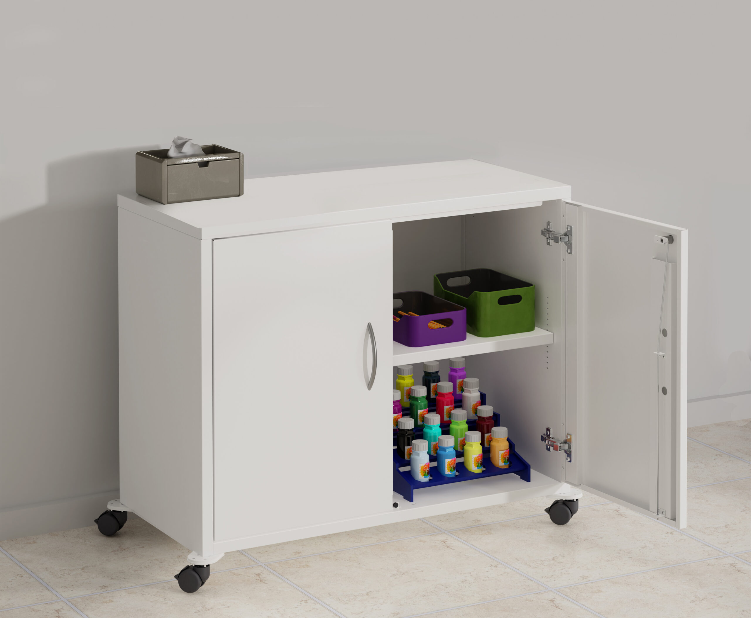 Stylishly designed, durably engineered, and built to perform, this mobile metal storage cabinet is a key addition to your educational space! Featuring easy-to-operate casters that allow you to reconfigure your space for various activities and teaching styles. Go with the flow and transition your space from rows to circles, large to small groups, or simply roll this cabinet out of the way for open floor space. Engineered to address classroom organizational hurdles, this mobile cabinet is meticulously crafted for your space!