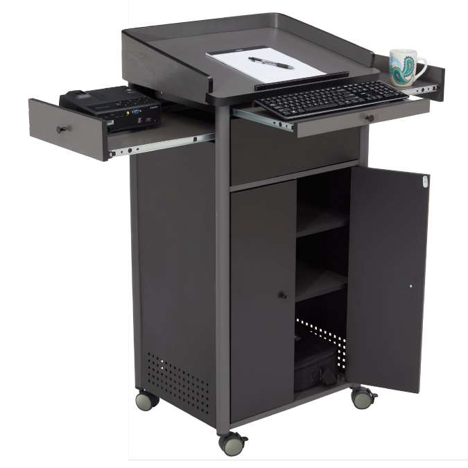 An elegantly designed to offer an all-in-one experience during your presentation. It offers a great amount of space, such as, a large reading surface, two side pull-out shelves, and a sliding keyboard tray. As well as three large shelves and an oversized front drawer designed to give the adequate amount of storage. For a complete multi-media presentation experience, a sound system with a gooseneck microphone and a tie-clip lapel microphone are included.