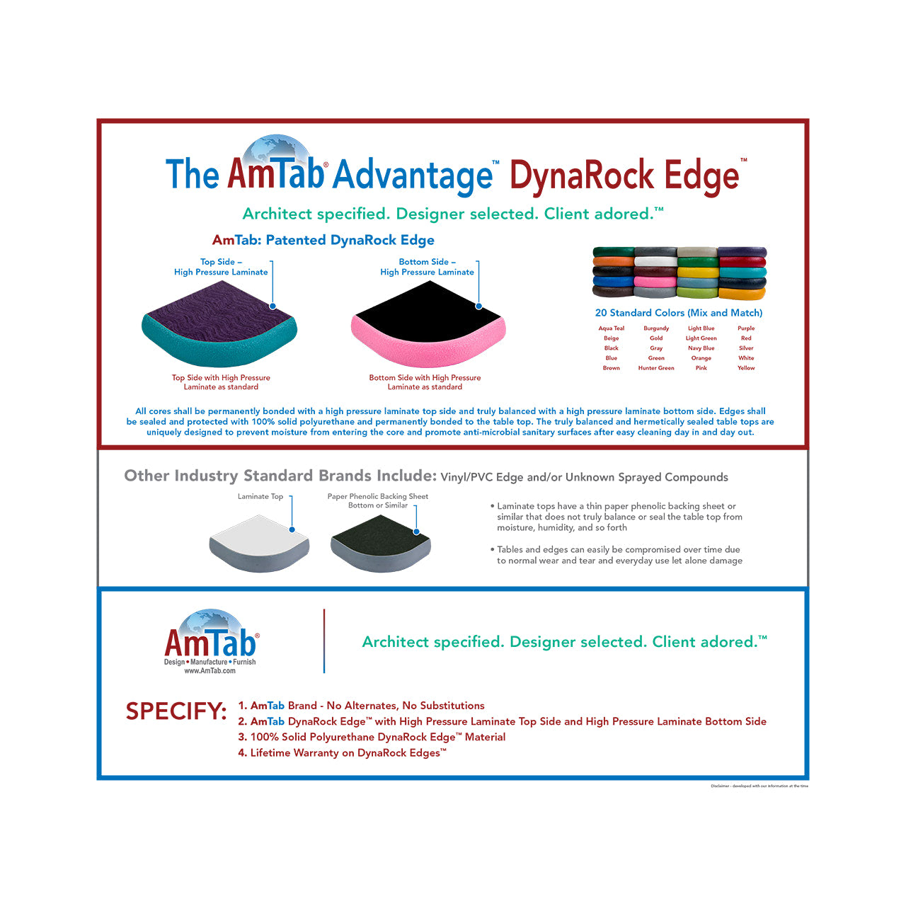 Used every day throughout the world in multi-purpose environments, this table offers an easy-to-use folding mechanism for compact storage. Engineered with safety, durability, ease of operation, and long-term value in mind. AmTab cafe tables are 100% Made in the USA, LEED 2009 certified, ANSI/BIFMA x7.1 certified, and MAS Green certified.