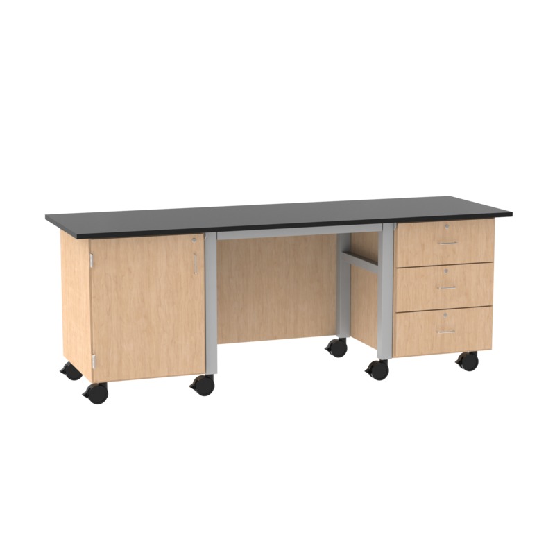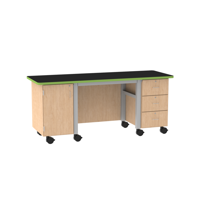 Designed with ample storage, this desk was engineered for teachers! Featuring a large cabinet and three pull-out drawers, all locking for secure storage. The cabinet includes one adjustable shelf. The ChemGuard top offers a durable laminate surface that is resistant to general chemical spills. Edge banding protects the table's core. The desk frame is tubular steel with a durable powder-coat. Mounted on swivel designer casters for easy mobility. Finished with a chemical-resistant UV coating.