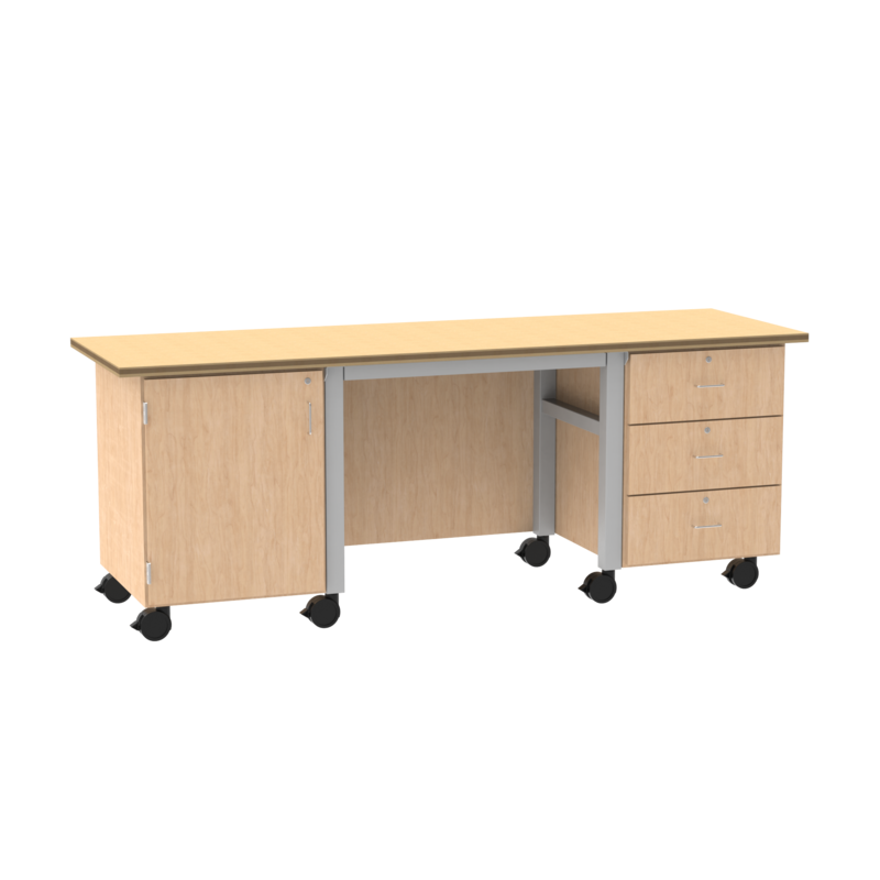 The perfect teacher work desk or demo station! Featuring just the right amount of storage with a hinged cabinet and locking sliding drawers. Each drawer and door has an integrated lock for security. The fashionable apron is made of solid wood and rests on a powder-coated steel frame. Wood is finished with a chemical-resistant UV finish.