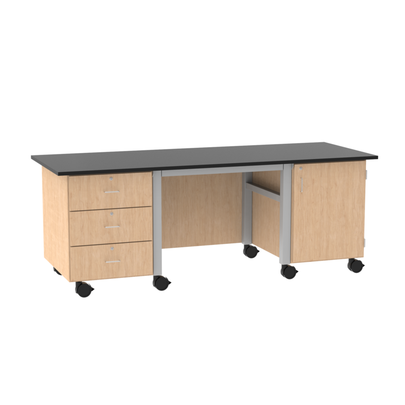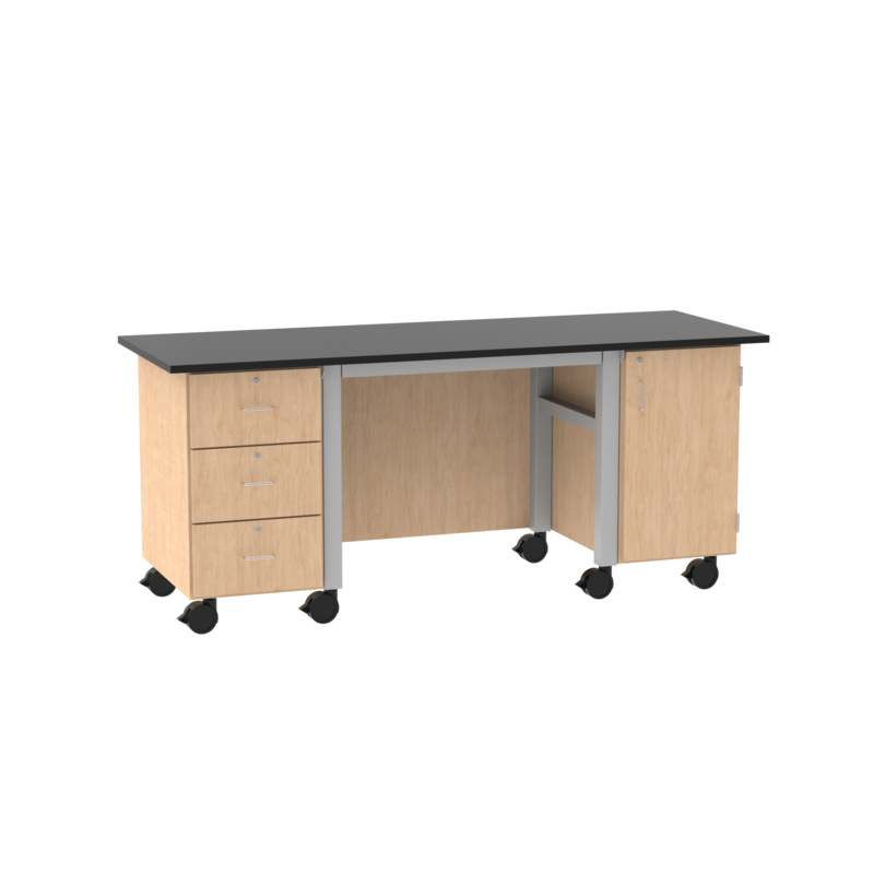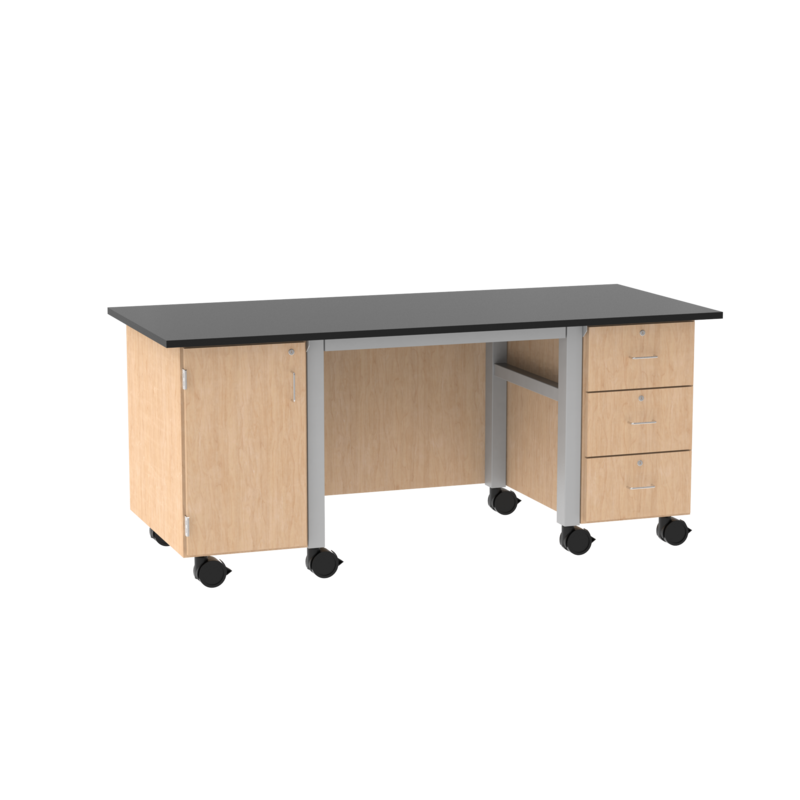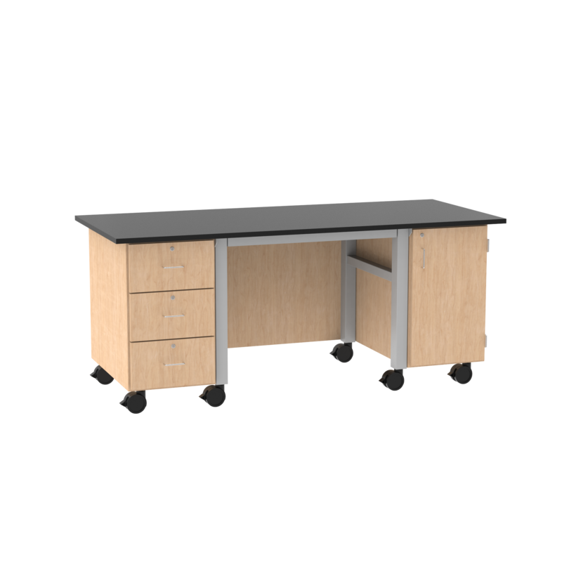 Engineered for a lab environment and designed with teachers in mind! A solid epoxy resin top that boasts chemical, heat, flame, and impact resistance is ideal for any STEM environment. Featuring a locking cabinet with adjustable shelf and three locking pull-out drawers for additional storage. The tubular steel desk frame is powder-coated for enhanced durability. Mounted on designer swivel casters for easy of maneuverability. Finished with an earth-friendly, chemical-resistant UV coating.
