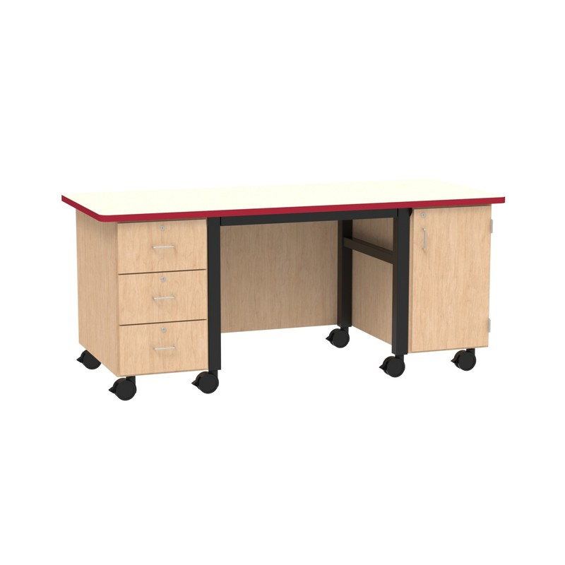 Look no further for the perfect teacher work desk or demo station! This unit is designed with ample storage, featuring both a large cabinet and three pull-out drawers, all locking. The cabinet includes one adjustable shelf for adaptable storage. Boasting a sleek, easy-to-clean high pressure laminate top, ideal for any classroom environment. The desk frame is tubular steel with a durable powder-coat. Mounted on swivel designer casters for easy mobility. Finished with a chemical-resistant UV coating.