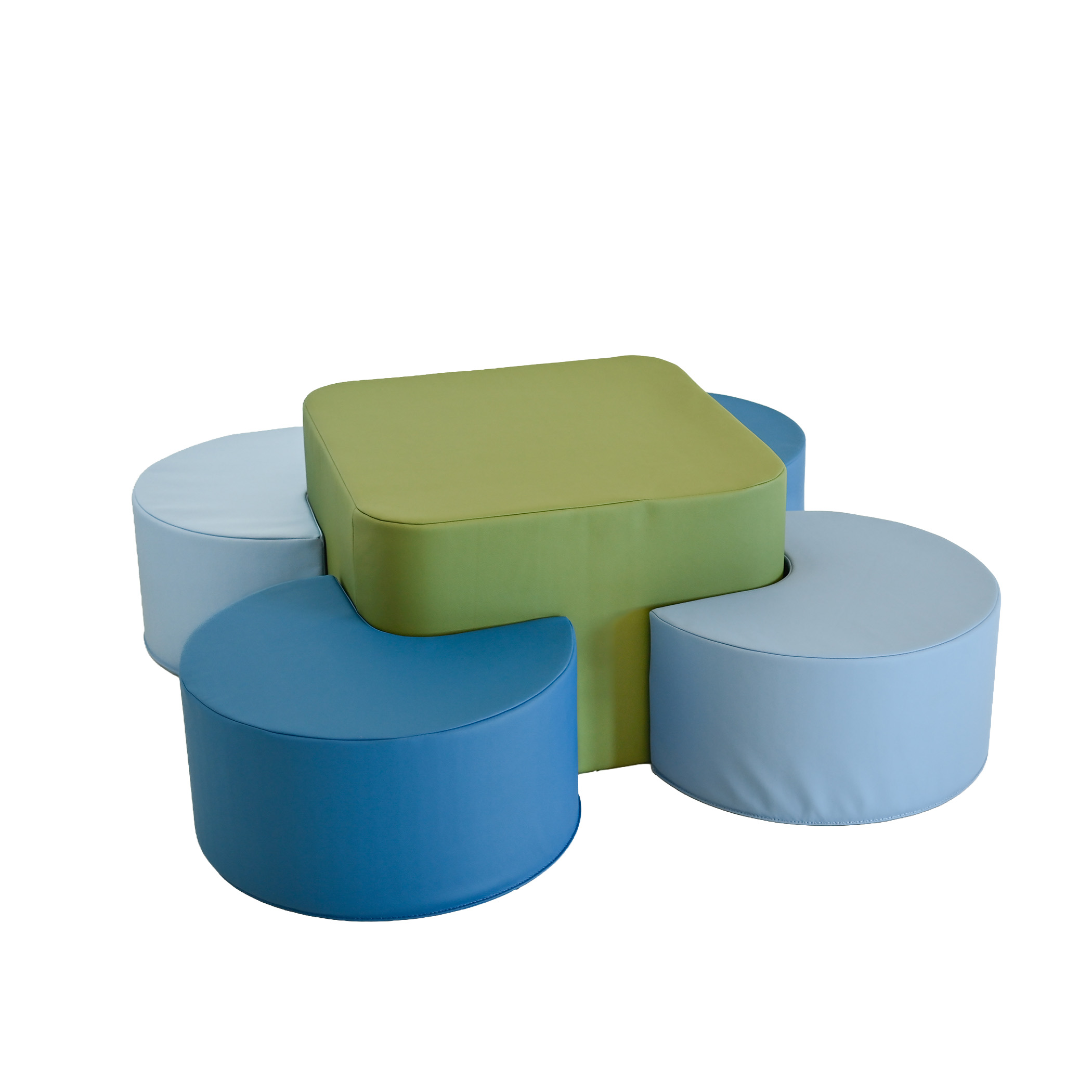 Build flexible learning spaces with this 5-piece modular classroom seating set featuring four ottomans and a center table. Constructed from CERTI-PUR US foam and encased in water resistant vegan leather, this cooperative classroom furniture is lightweight, durable, and easy to move for an adaptable classroom layout. Created with indoor air quality in mind this classroom set is GreenGuard Gold Certified, meeting chemical emissions standards and making it a healthier choice for kid’s play areas. This soft foam classroom furniture supports active learning, student collaboration, and contemporary classroom design for children ages 2 and older.