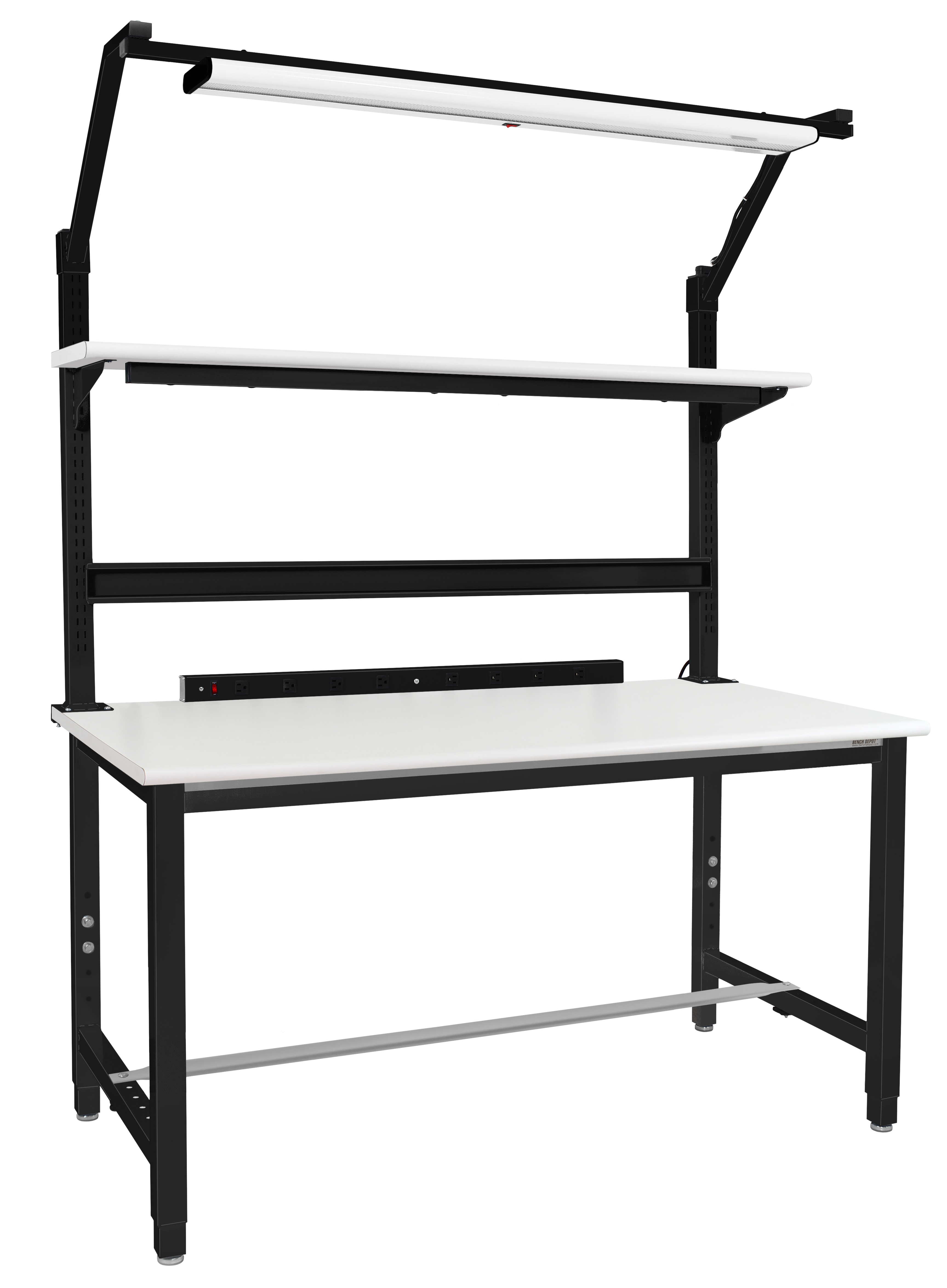 This multi-purpose workstation features a durable laminate top with rounded front edge. An aluminum sheet covers the bottom, helping to prevent warping. The heavy-duty steel frame and adjustable-height legs feature a corrosion-resistant powder-coat finish designed to last for years of use. To complete the workstation, a set of uprights with a power plug is included, along with an adjustable top shelf, LED overhead light, adjustable light frame, bin box rail, painted footrest, and a full power strip. This workstation is a great addition to your workshop, makerspace, or other working environment!