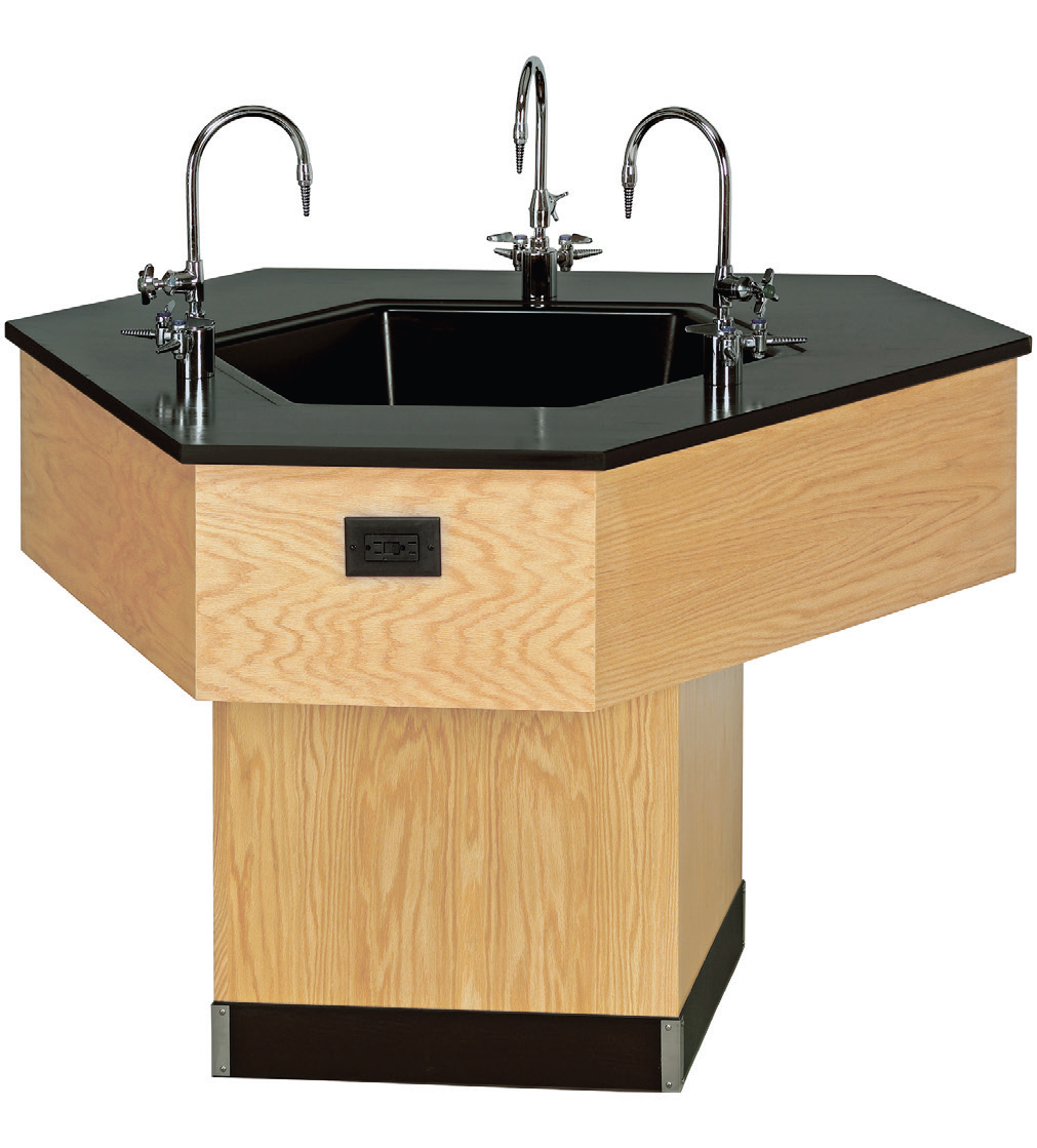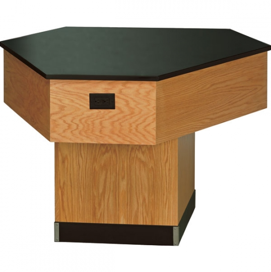 A hexagonal workstation engineered for three students to collaborate during class. Featuring a solid epoxy resin top, boasting impressive chemical, flame, heat, and impact resistance. The pedestal is constructed of solid hardwood with veneers. Three dual GFI receptacles are integrated for convenient power access. The wiring can be accessed easily through the removable center panel. Rubber base molding with metal corner plates ensure a long lasting workstation.