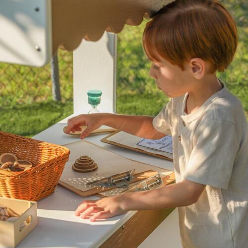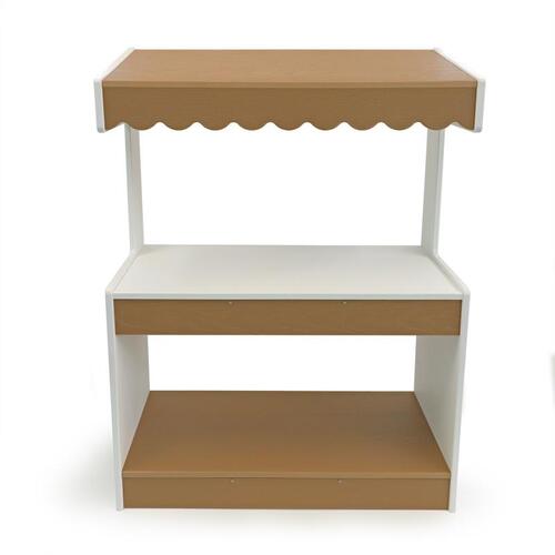 This adorable and versatile stand is perfect for pretend play, able to be used as a puppet theater, post office counter, farmer's market, lemonade stand, ice cream counter, grocery store or other type of checkout. This stand can be whatever a child can imagine and have use for. The above awning is gently sloped to keep rain away from the play surface. The awning front can be used to make announcements, or display specials that clean up easily with mild soap and water. Designed for convenience, the stand features a large open storage shelf below the play counter that can be accessible from either side. Beautifully crafted from textured woodgrain maple and polar white HPDE thermoplastic structural elements, this set features sleek clean lines with refined contrasting color accents. Rust-resistant stainless steel hardware. The UV stabilized HDPE thermoplastic is highly durable, resisting fading, stains, mold and mildew and won't chip, delaminate, rot, splinter, or absorb moisture, bacteria or odors. The white panels do not absorb or reflect heat from the sun. UV stabilized grade HPDE is more recyclable than many other plastics, supporting a more circular economy by reducing waste. Proudly made in the USA.