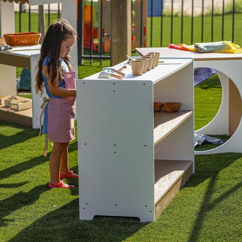 Outdoor storage with a fresh modern flair! One top with two fixed shelves provide ample storage space for outdoor learning materials. Young learners can easily see and access materials from both sides. The 16-inch cabinet depth is ideal for increased storage capacity and added stability. Beautifully crafted from textured woodgrain maple and polar white HPDE thermoplastic structural elements, this set features sleek clean lines with refined contrasting color accents. Rust-resistant stainless steel hardware. The UV stabilized HDPE thermoplastic is highly durable, resisting fading, stains, mold and mildew and won't chip, delaminate, rot, splinter, or absorb moisture, bacteria or odors. The white panels do not absorb or reflect heat from the sun. UV stabilized grade HPDE is more recyclable than many other plastics, supporting a more circular economy by reducing waste. Proudly made in the USA.