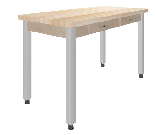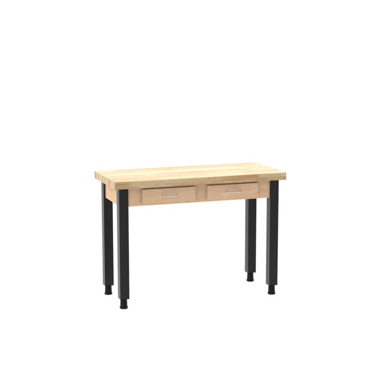 Designed with function in mind, this table includes two drawers built into the apron for easy-to-access storage. Featuring a solid maple butcher block top secured with steel corner braces to prevent wobbling. The steel legs are powder-coated for additional protection. Non-skid, adjustable glides allow for a level work surface on uneven floors.