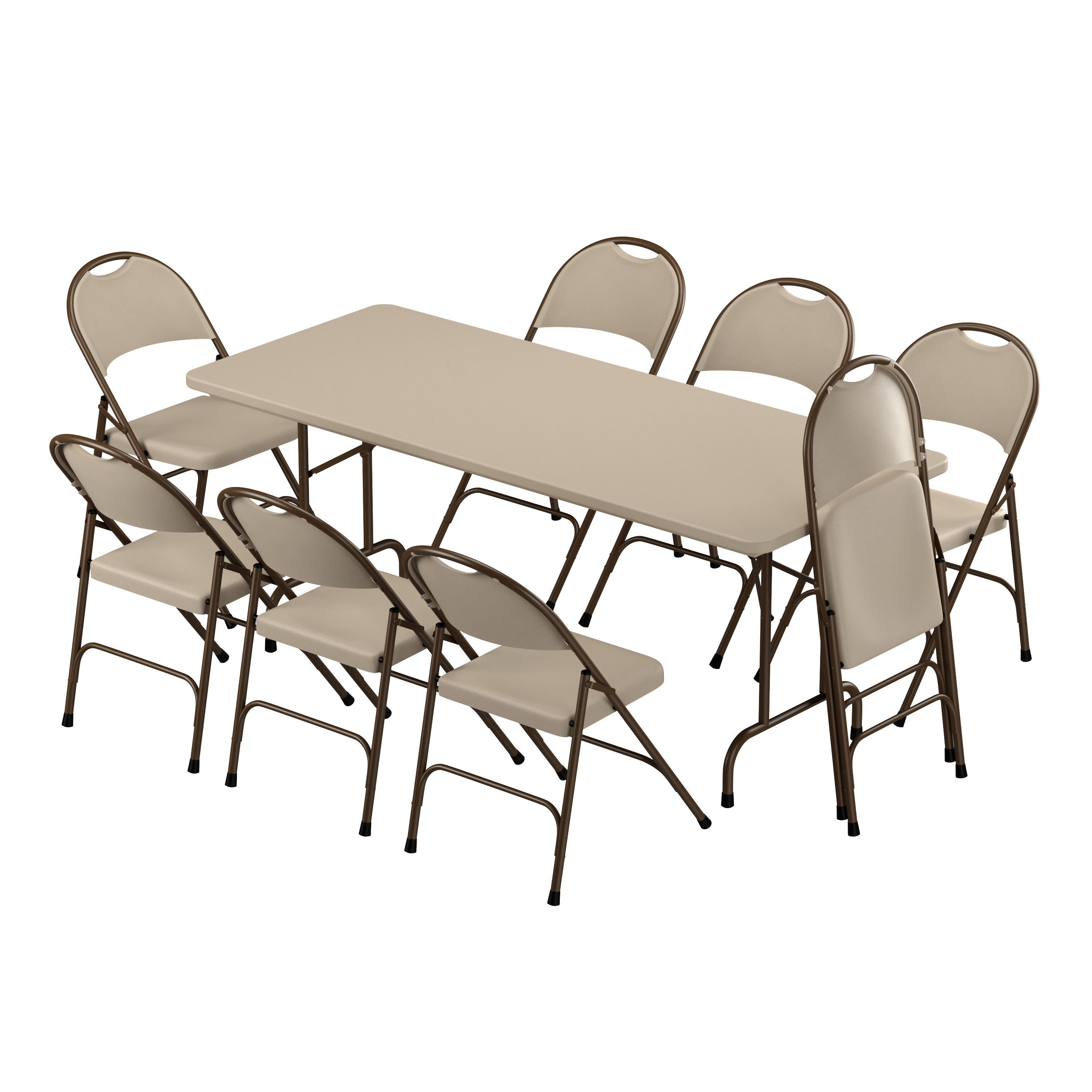 This set includes one rectangular plastic folding table, and eight matching folding chairs. The color fully permeates the plastic; meaning it will not scratch or wear off. Blow- and injection-molding processes create a waterproof seal, allowing both the tables and chairs to be used outdoors. They also feature a lightweight construction for easy setup and breakdown. A steel ladder frame supports the underside of the table for added strength. An integrated automatic lock-open mechanism ensures an easy and safe table setup. The chairs feature a unique circular fan designed back. A half-moon shaped cutout acts as a convenient handle for portability. Both the table and chairs feature non-marring foot caps to protect floors.