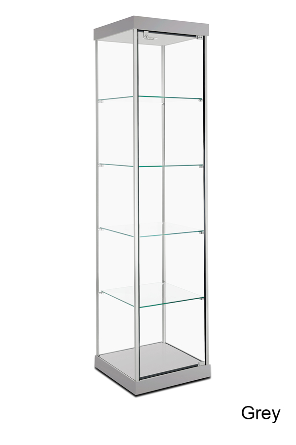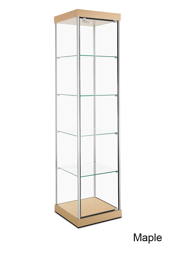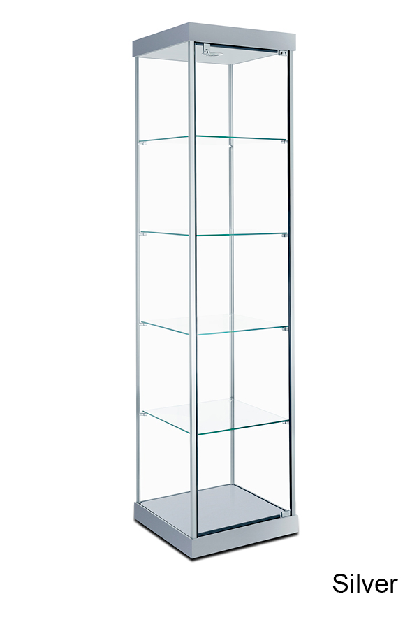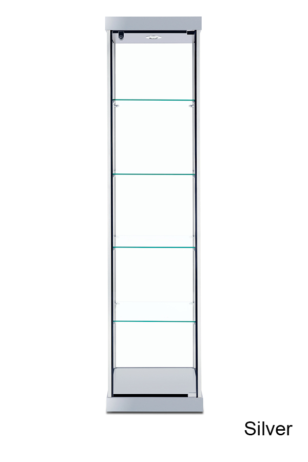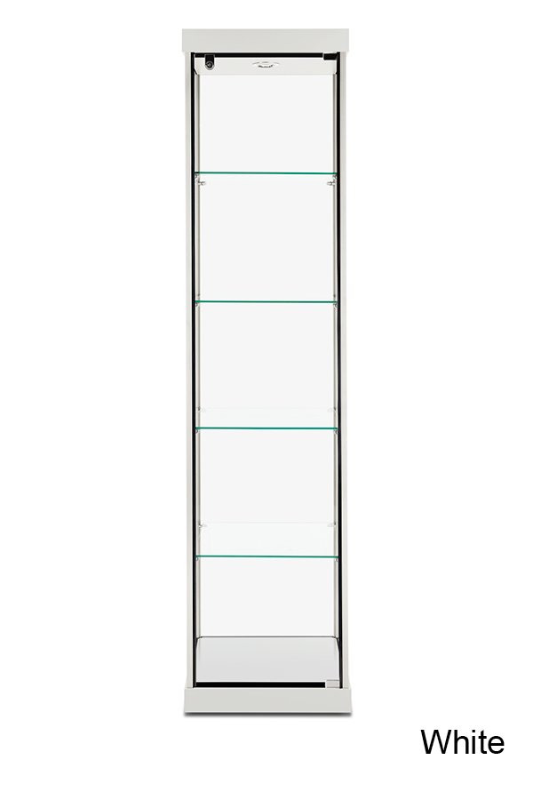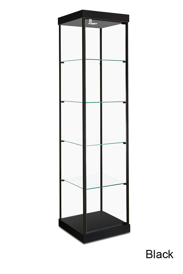A sensational display case tower designed with a modern look! Behind the locking glass door there are fully adjustable glass shelves that can accommodate various sized items. LED lighting is installed in the top to accent your displayed trophies, awards, artwork, products, or more! Features a laminated top and bottom.