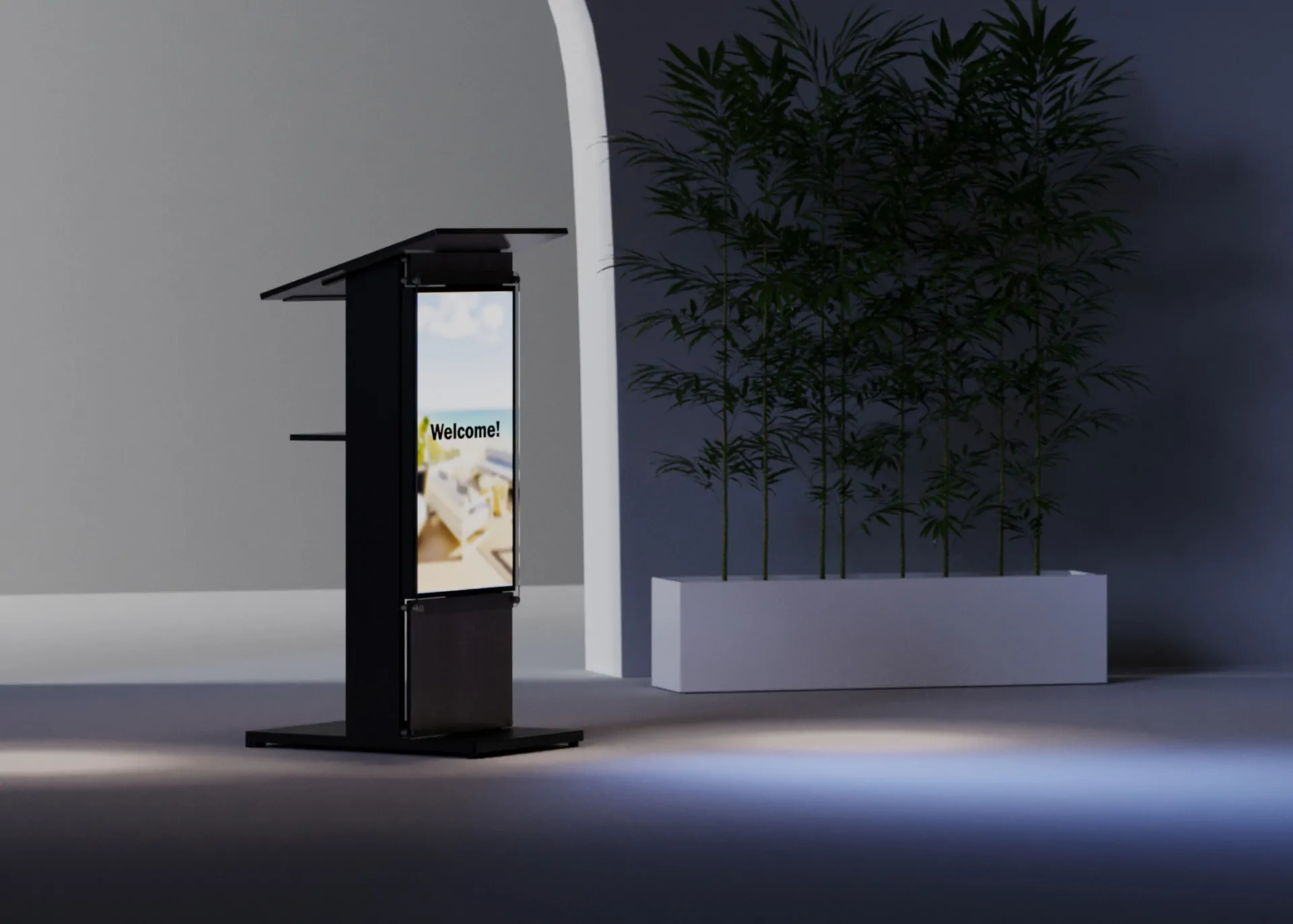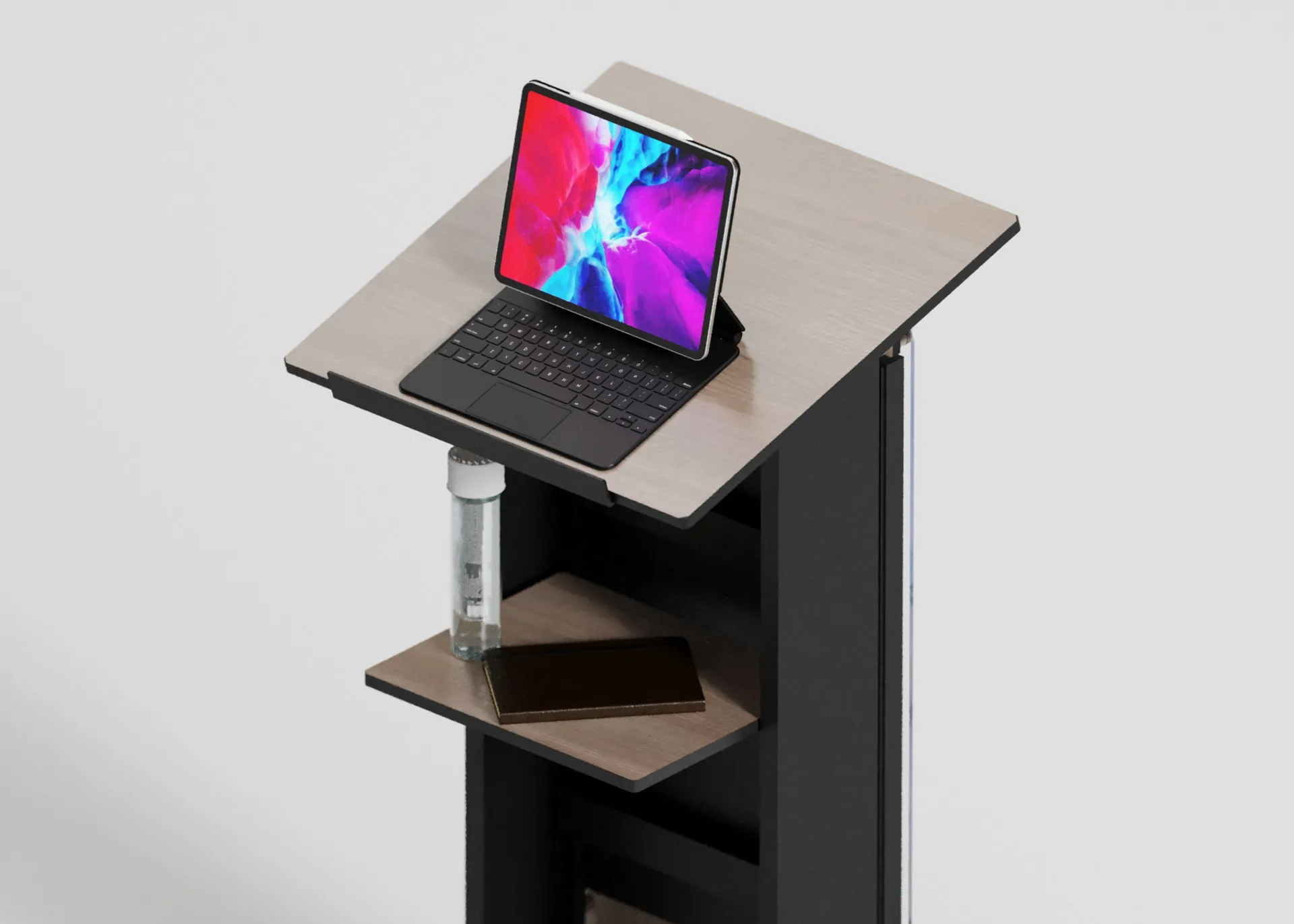 Designed to enhance meeting spaces and events, this modern podium is built for the digital age. The face of the podium includes an integrated HD display, providing presenters the ability to showcase visuals, project content, or stream live updates without extra equipment. An included surge protector with power access alongside the integrated grommets reduces messy cables. An onboard shelf provides light storage for convenience when presenting. Built-in casters make mobility from one presentation to the next a breeze. Keep audiences engaged and messages clear with a sleek, sustainable, and mobile podium that boasts professional presence. From boardrooms to classrooms, this podium makes every presentation seamless.