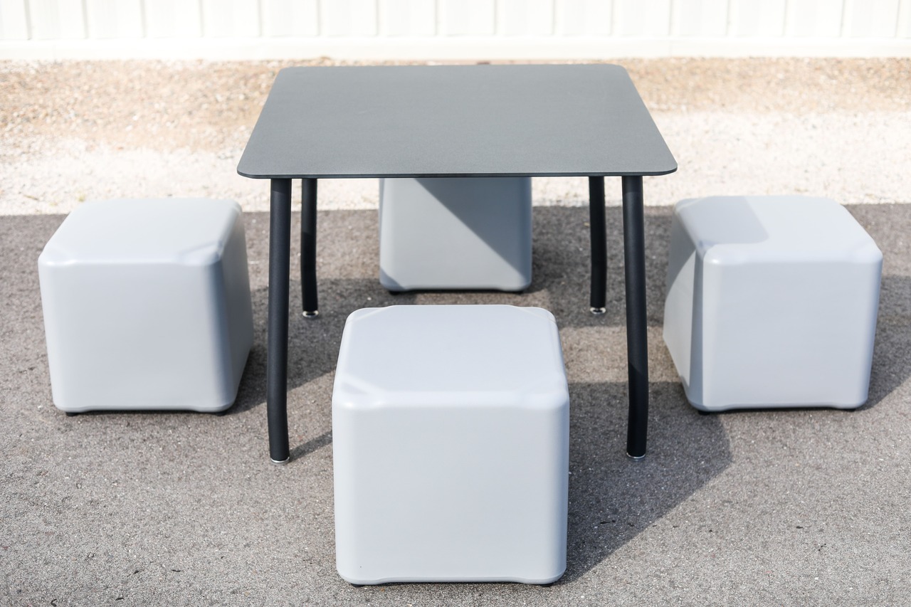 Tables that delivers exceptional outdoor performance and also perfect for indoor use. The materials can handle year round exposure to rain, salt, sand, and snow. Featuring rugged steel legs with high performance outdoor powder coated finish, compact laminate table tops, stainless steel leveling glides and hardware, and optional outdoor locking casters. Table Top Material Compact Laminate (a.k.a. Solid Panel Phenolic). Waterproof material with baked on UV fade resistant colored top and bottom surface. The material is self-edging and zero edge banding is needed or applied. The material emits zero formaldehyde and is most frequently used as a Class A or Class B fire resistant exterior building cladding and rain screen. The material is also widely used for healthcare interior surfaces that need to be easily cleaned and disinfected multiple times per day. Table Legs & Fasteners Steel Legs offer superior strength and then we add outdoor powder coating that has been saltwater spray tested for outdoor applications in coastal areas and where de-icing salts are used. Stainless steel leveling glides are a standard feature and the option for outdoor locking casters is also available for our customers that need to shift their spaces around frequently. Stainless steel fasteners are included to finish the 5 minute assembly.