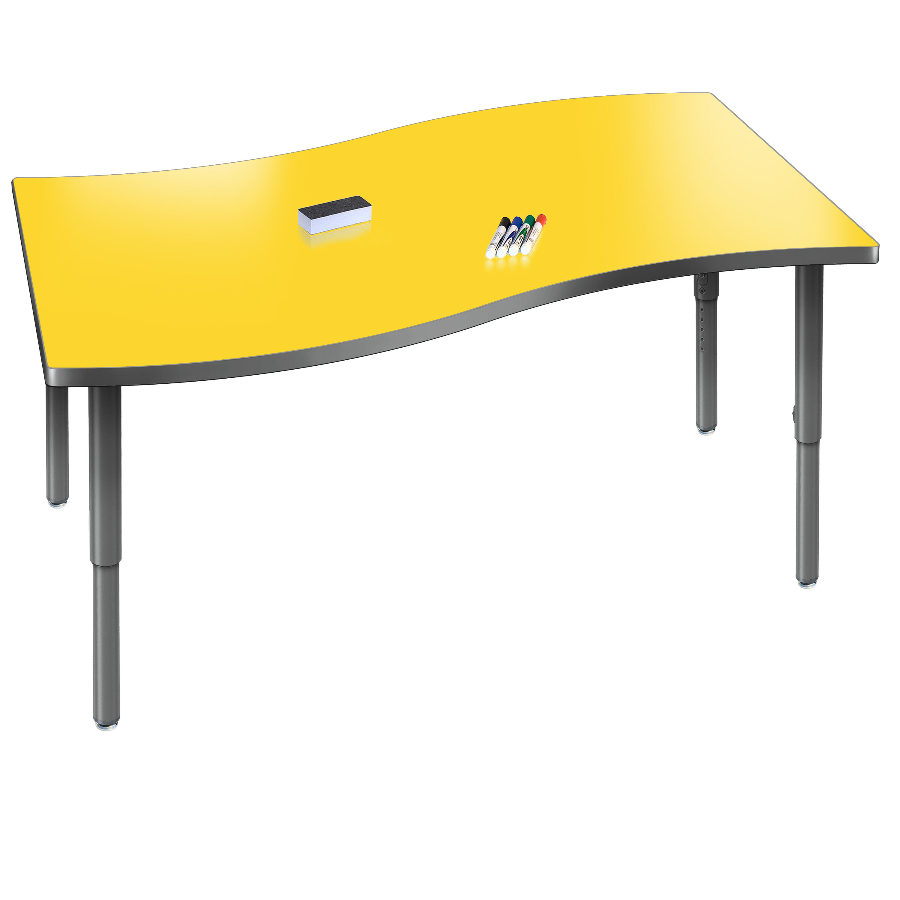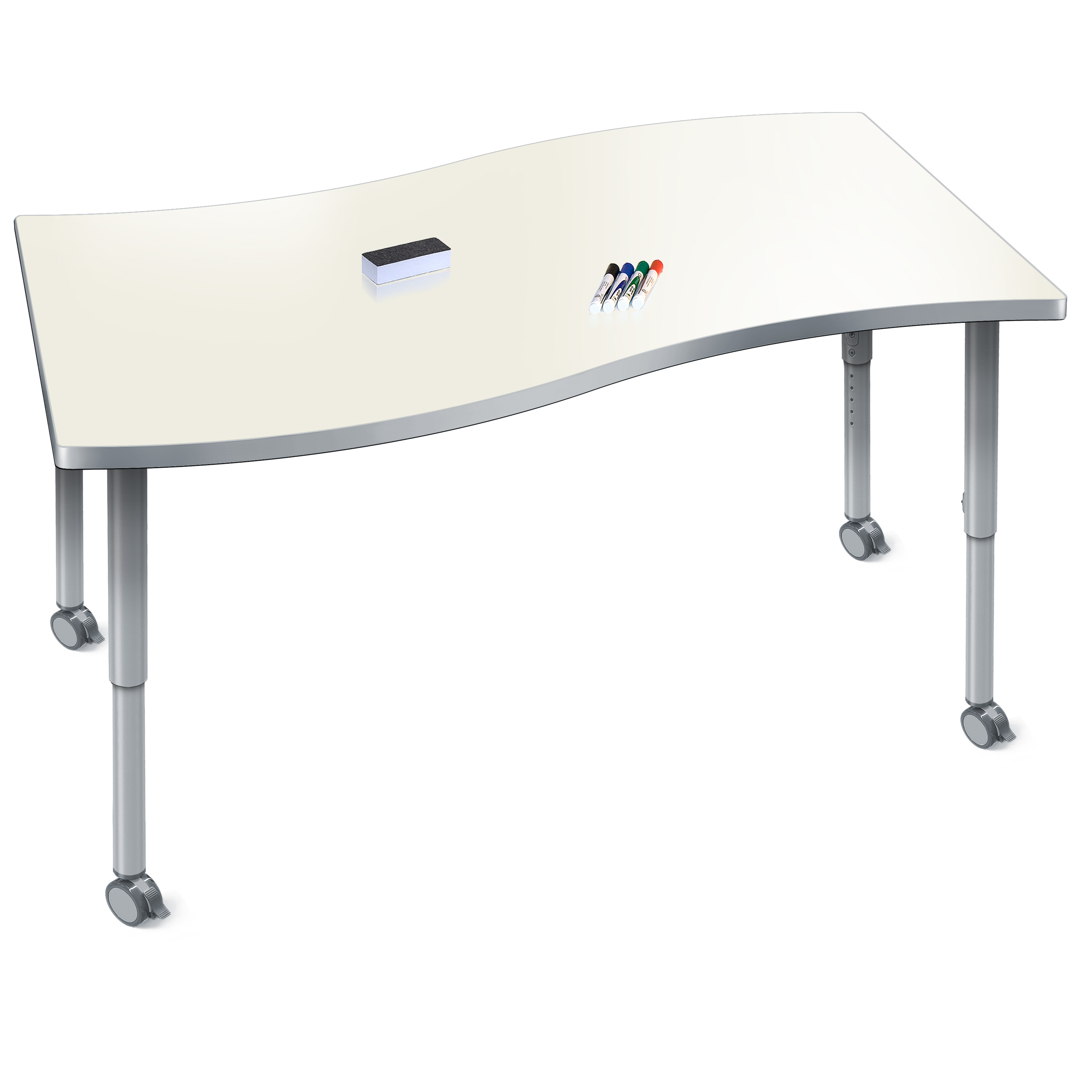 Create a modern brainstorming station in any space! The Velocity Surge Shaped Dry Erase Table combines stylish contemporary design with durable functionality for a versatile classroom table. The dry erase tabletop is ideal for brainstorming by creating a perfect interactive canvas for doodling or taking class notes. The wavy surge shape naturally brings people together, fostering spontaneous thinking, open conversation, and creative exchange. Equipped with standard nylon swivel glides or optional locking casters, it's simple to move and rearrange these tables.