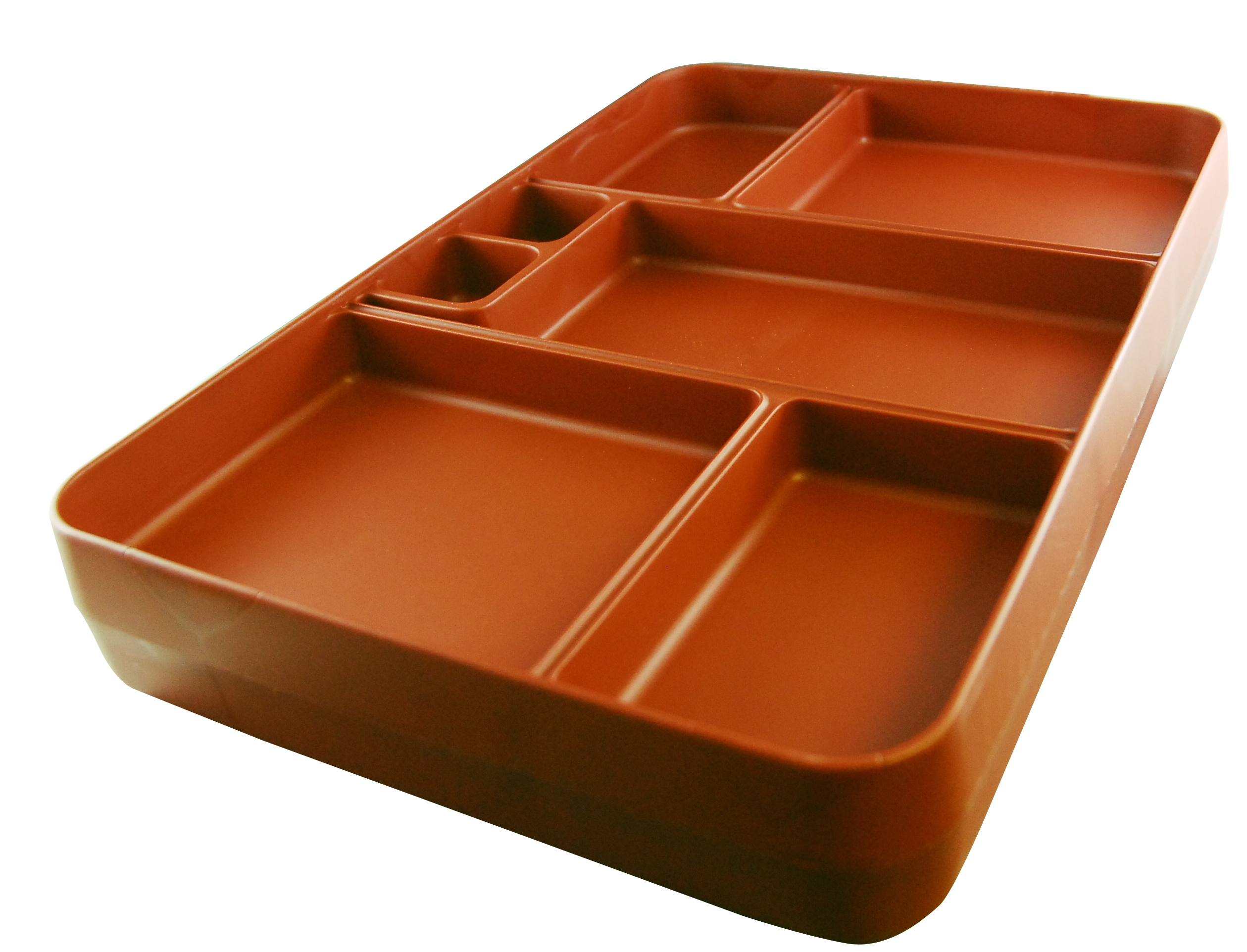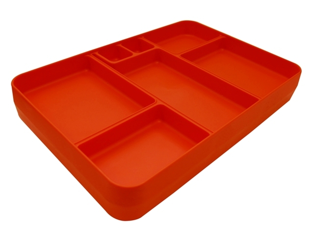 Thermally insulated food trays with a seamless, one-piece design that can be stacked, with or without lids, indiscriminately. Featuring food compartments and insulated condiment compartments to maintain temperature and prevent water absorption. Lids sold separately.